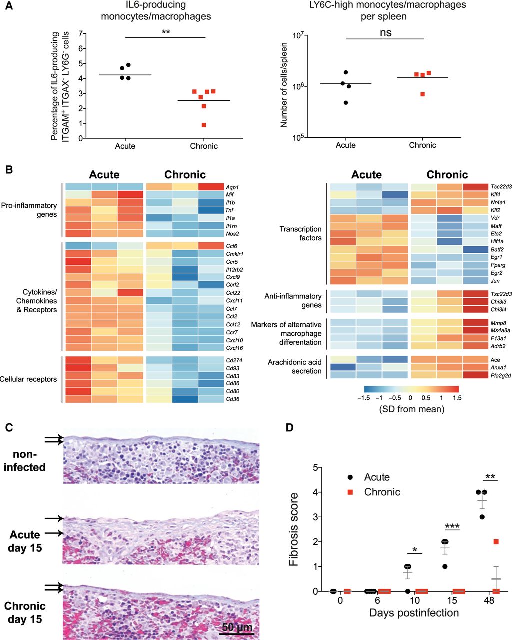Early shift from inflammatory to pro-resolving monocytes/macrophages in chronic infection to prevent fibrosis. (A) Percentage of IL6-producing ITGAM+ ITGAX− LY6G− (also known as CD11b+ CD11c− LY6G−) cells and number of LY6C high monocytes/macrophages per spleen at day 6 postinfection. (B) Heatmap illustrating the relative expression of genes in monocyte/macrophages from acute and chronic infected mice at day 6 PI. (C) Representative images of Masson's trichrome staining of spleens. Thickness of the splenic capsules are marked by arrows. Magnification bar: 50 µm. (D) Semiquantification of fibrosis in spleens. (A–D) Data shown are the mean ± SEM of n = 4 to 6 mice. (*) P ≤ 0.05; (**) P ≤ 0.01; (***) P ≤ 0.001 unpaired two-tailed t-test.