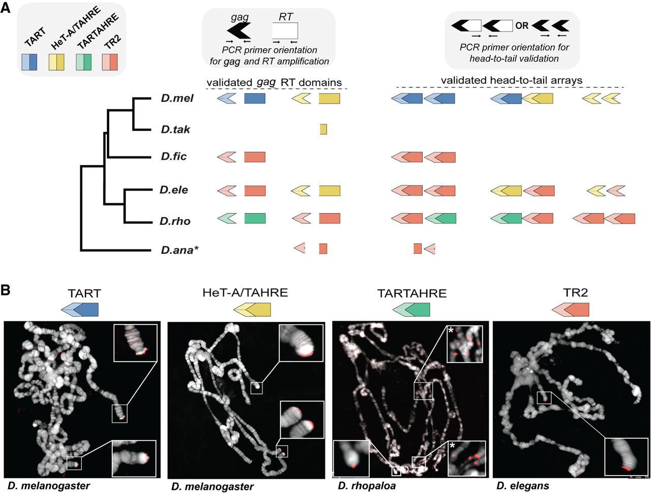 PCR- and cytology-based validation of in silico–predicted, telomere-specialized elements. (A) Cartoon representation of our PCR-based validation of in silico–predicted gag and RT domains and head-to-tail orientation of candidate telomeric retrotransposons (and the previously validated HeT-A/TAHRE and TART). Primer orientation is represented above as cartoons in white and black. gag (arrowhead) and RT (rectangle) domains are represented by lighter or darker shades, respectively. PCR-validated partial gag and partial RT domains are represented as truncated symbols in D. takahashii and D. ananassae. (B) DNA-FISH or oligopainting with probes/paints cognate to HeT-A/TAHRE gag, TART, TARTAHRE, and TR2 on polytene chromosomes from representative species. HeT-A/TAHRE and TART from D. melanogaster serve as positive controls. All insets show telomere hybridization exclusively except TARTAHRE, which hybridized to both telomeric and nontelomeric locations (insets designated with an asterisk).