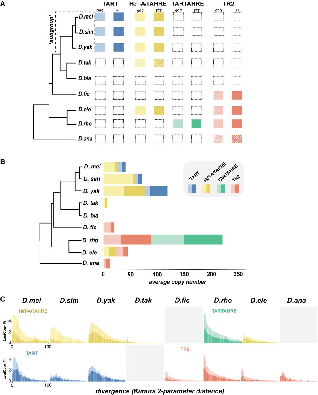 Telomeric retrotransposon identity, copy number, and history across the melanogaster species group. (A) Presence/absence of telomere-localized elements across the melanogaster species group. Each column represents a phylogenetically distinct lineage defined and validated in Figures 1 and 2, respectively. Hatched lines delineate elements for which only a degraded version was recovered. gag and RT domains are represented by lighter and darker shaded boxes, respectively. (B) Estimated gag (light) and RT (dark) copy number per species calculated from the average read depth of a consensus sequence relative to genome-wide estimates. (C) Repeat landscapes of telomere-specialized retrotransposons captured by Kimura two-parameter distance between genomic reads with significant BLAST hits (>90% identity). Copy number (consensus read no. / genome-wide average read no.) appears on the y-axis, and binned divergence classes appears on the x-axis. The bins closest to zero putatively represent the youngest classes. We estimated divergence for the gag (lighter shade) and RT (darker shade) separately.