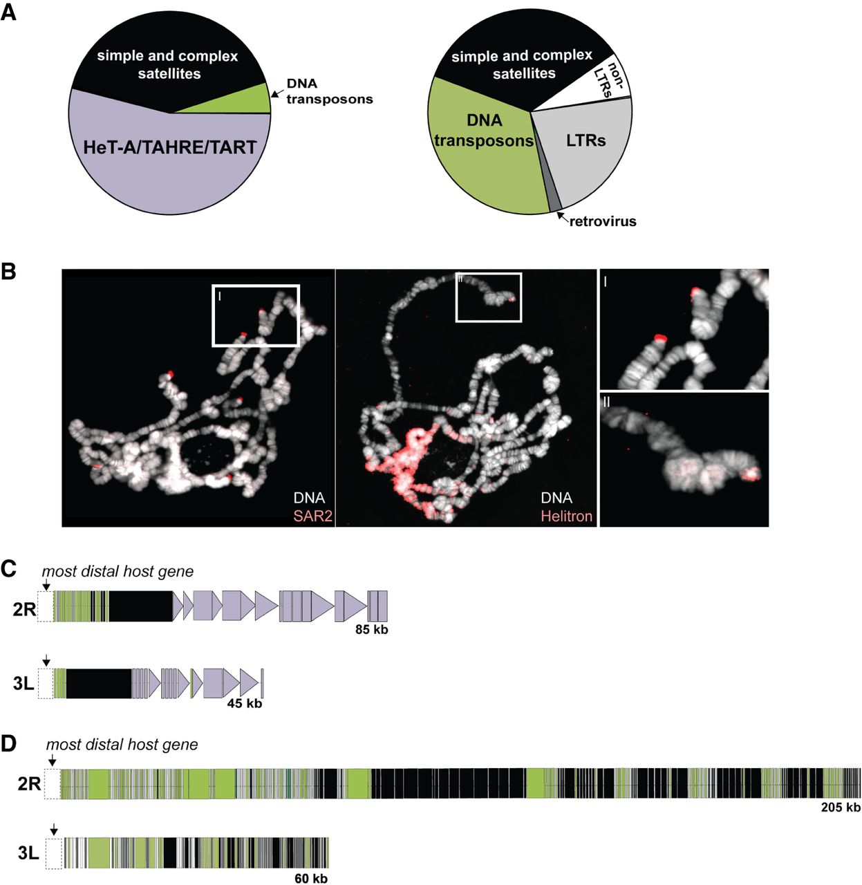 Collapse of the retrotransposon-based telomere elongation mechanism in D. biarmipes. (A) Composition of D. melanogaster and D. biarmipes chromosomes between the most distal, protein-coding gene and the terminal nucleotide. Fractions estimated from the distal sequence (assembled from PacBio-generated long reads for both species) for Muller elements corresponding to 2L, 2R, 3L, and 3R. Purple corresponds to telomere-specialized, jockey family retrotransposons found in D. melanogaster (but not in D. biarmipes). (B) Fluorescent in situ hybridization of SAR2 and Helitron probes to polytene chromosomes from D. biarmipes. Insets I and II show telomere localization of SAR2 and Helitrons, respectively, on D. biarmipes polytene chromosomes. (C) Schematic representation of the long-read–based assembly of D. melanogaster 2R and 3L telomeric DNA. Telomere-specialized, jockey-like elements (purple) are distal to a block of simple and complex satellites (black), consistent with previous reports. Triangles represent full-length elements, and rectangles represent partially degenerated elements. (D) Schematic representation of the long read–based assembly of 2R and 3L telomeres from D. biarmipes in which simple and complex satellite DNA (black) is juxtaposed with primarily Helitron DNA transposons (green).