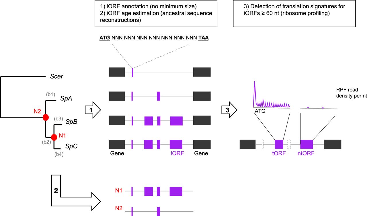 Overview of iORF annotation and translation detection procedure. For a more complete description, see Methods and Supplemental Figure S1. iORF annotation was conducted using S. paradoxus strains that are structured in three main lineages (SpA, SpB, and SpC) with S. cerevisiae as an outgroup. Pairs of genes annotated as syntenic were used to align intergenic genomic regions in which iORFs were characterized. The age of an iORF was estimated using reconstructions of ancestral intergenic sequences at nodes N1 and N2 (in red) to infer their emergence along phylogenetic branches (named b1 to b4, in gray). We chose four strains (one per S. paradoxus lineage and one S. cerevisiae) to characterize the repertoire of translated iORFs (tORFs) using ribosome profiling. iORFs without translation signature were named ntORFs.