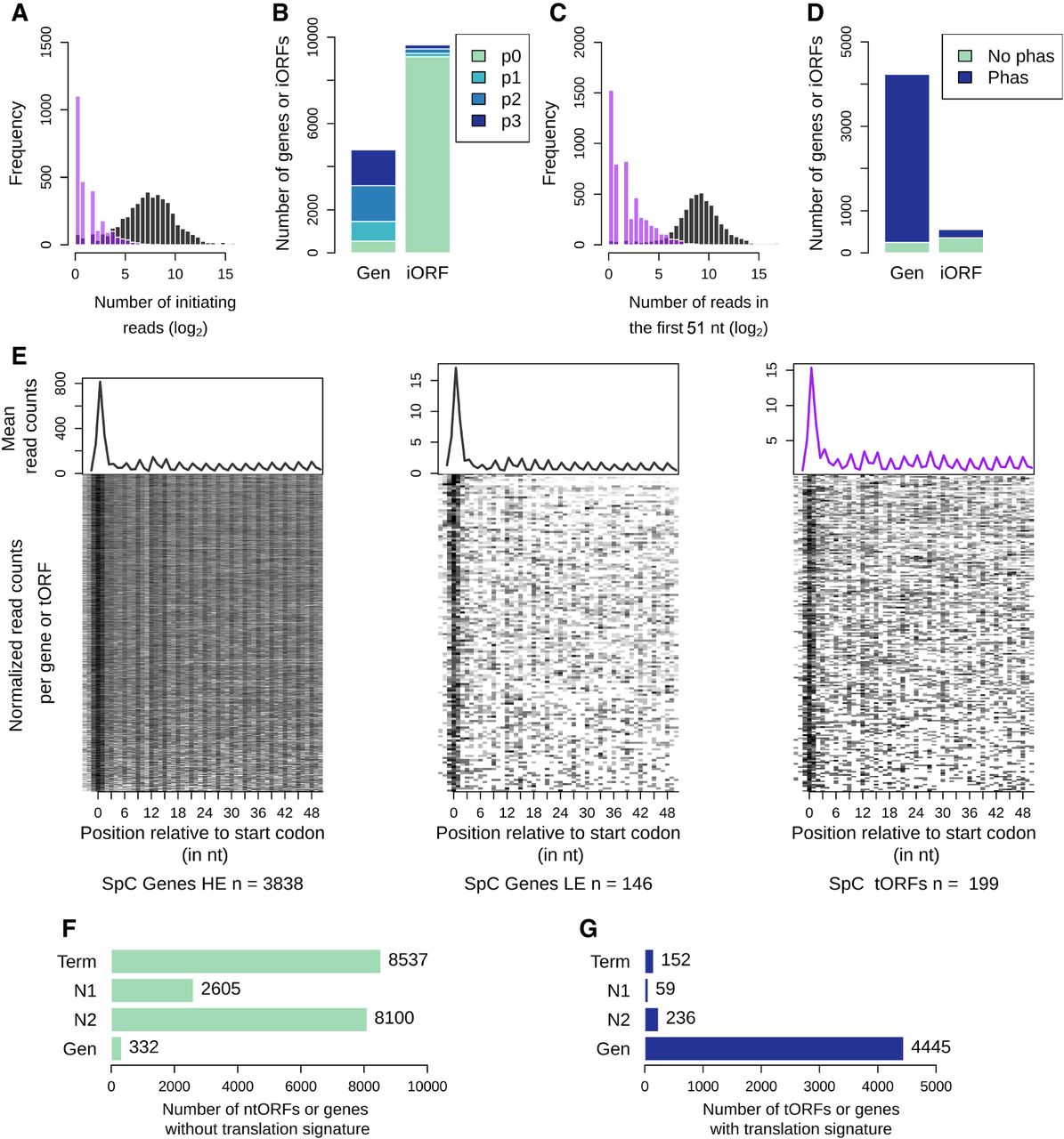 A fraction of the iORFs display translation signatures similar to genes. (A) Distribution of the ribosome profiling read counts for genes (gray) and iORFs (purple) at the start codon position. (B) Number of genes (Gen) or iORFs with a detected initiation peak at the start codon position. Peaks are colored according to the precision of the detection (see Methods), from the most precise (p3) to the least precise (p1). Genes and iORFs with no peaks detected are shown in green (p0). (C) Distribution of the ribosome profiling read counts in the first 51 nt of iORFs, excluding the start codon. (D) Proportions of genes or iORFs with a significant in-frame codon periodicity (read phasing in blue) among genes and iORFs with a detected initiation peak. Genes and iORFs with no detected phasing are shown in green. (E) Metagene analysis for significantly high (HE; left) or low (LE; middle) translated genes (gray) and for intergenic tORFs (purple; right). The mean of the 5′ read counts is plotted along the position relative to the start codon for significantly translated genes or tORFs. The lines of the matrix indicate the normalized coverage of genes or tORFs with significant translation signatures, with one feature per line. (A–E) Results for the SpC strain MSH587-1 are shown (for SpA and SpB results, see Supplemental Fig. S3). (F,G) Number of genes or iORFs without (ntORFs; F) or with (tORFs; G) translation signatures detected in at least one of the four strains. Actual numbers are indicated next to each bar. iORFs are classified according to their age (N2, N1, or Term; see Methods) (Fig. 1; Table 1).