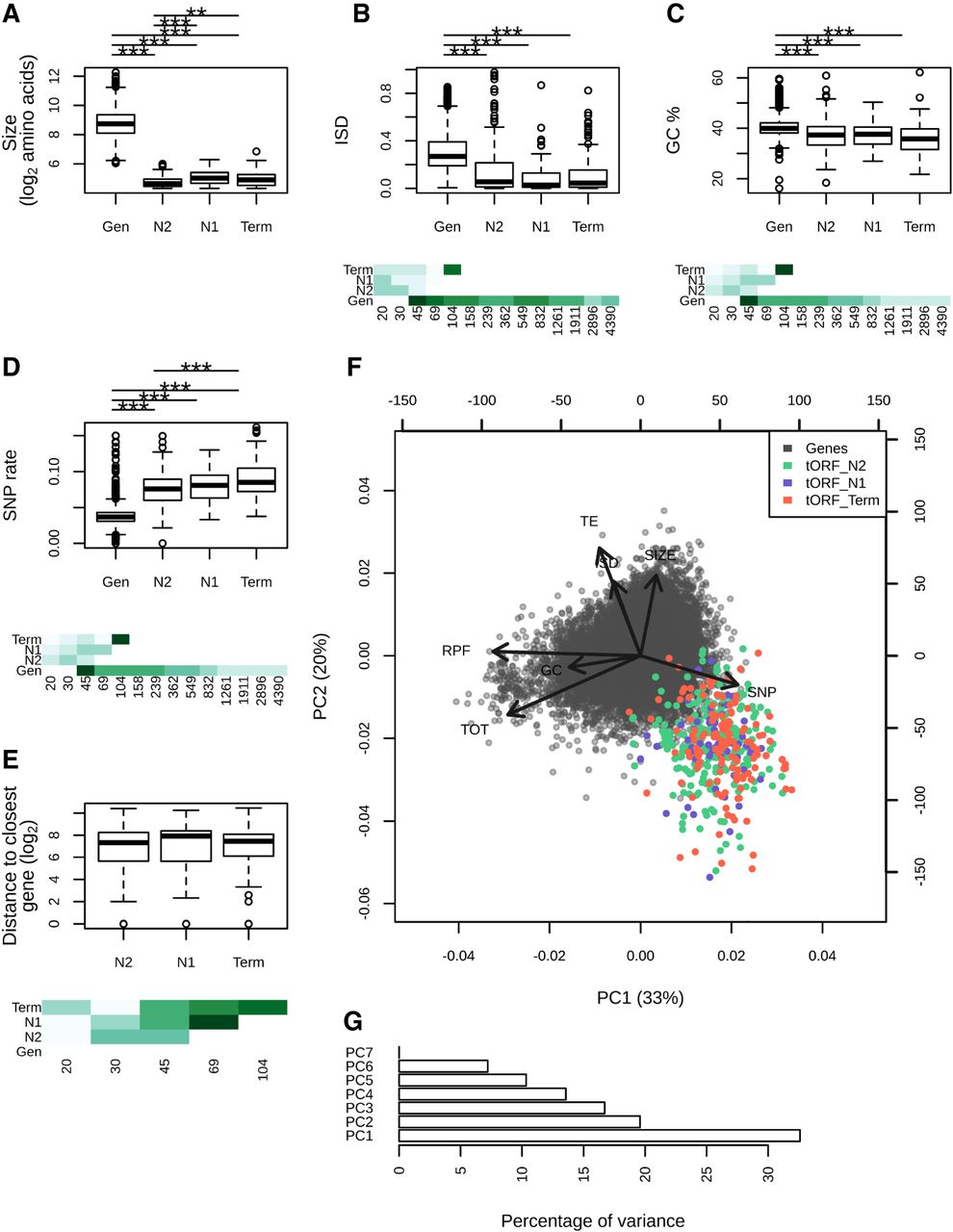 Age-dependent characteristics of intergenic polypeptides. (A–E) Sizes (log2 number of residues), mean disorder (ISD), GC%, SNP density, and distance to the closest gene are displayed for genes and tORFs as a function of their age (N2, N1, and Term). Pairwise significant differences are displayed above each plot: Wilcoxon test; (***) P-values <0.001, (**) P-values <0.01, and (*) P-values <0.05. Mean estimates per size range are colored in shades of green (from pale for low values to dark green high values). (F) Principal component analysis using the number of residues (SIZE in log2), ribosome profiling (RPF), total RNA (TOT) and TE (as read counts in the first 60 nt normalized to correct for library size differences and in log2), intrinsic disorder (ISD), the GC%, and SNP density (SNP). tORFs are colored as a function of their age. (G) Percentage of variance explained by each PCA axis (the two first axes explain 33% and 20% of the variation for a total of 53%).