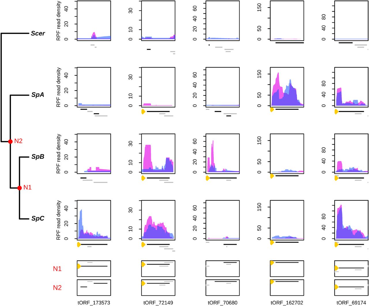 A continuous emergence of putative polypeptides in S. paradoxus. Normalized RPF read coverage for a selection of lineage-specific (or group-specific) tORFs per strain. RPF read coverages are displayed for replicate 1 and 2 with a blue or pink area, respectively. The positions of all iORFs (including ntORFs and tORFs) in the genomic area are drawn below each plot. The tORF of interest is labeled with a yellow dot and is plotted in black. iORFs overlapping the iORF of interest are plotted in black when they are in the same reading frame and in gray when they are in a different reading frame than the selected tORF.