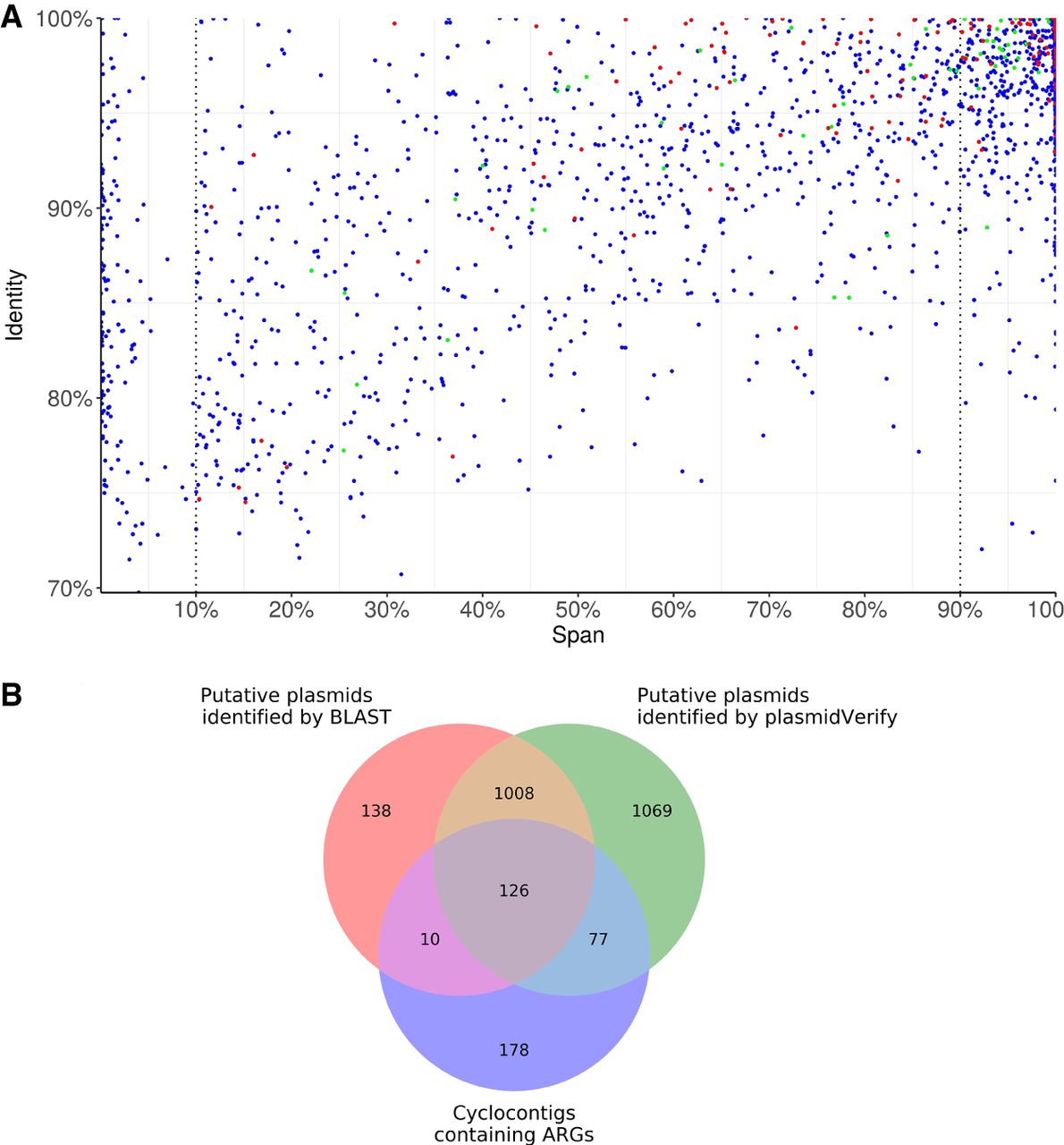 The scatter plot of the span and identity for all 2280 unique cyclocontigs in the ISOLATES data set reconstructed by plasmidSPAdes+ (A) and the Venn diagram for cyclocontigs identified as plasmids by plasmidVerify, cyclocontigs identified as plasmids by BLAST (span >10%), and cyclocontigs containing ARGs (B). (A) Each dot represents a cyclocontig reported by plasmidSPAdes and verified by plasmidVerify. Red dots represent cyclocontigs containing antibiotic-resistance genes (ARGs). Green dots represent cyclocontigs classified as viral sequences. (B) The Venn diagram illustrates that the HMM-based approach in metaplasmidSPAdes identifies many plasmids with important phenotypes that are missed by a straightforward BLAST-based approach.