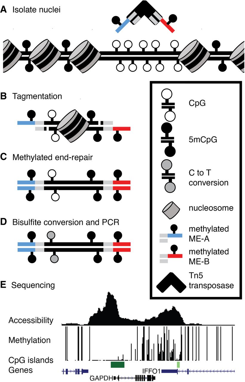 Overview of mATAC-seq. (A) Tn5 carrying methylated oligonucleotides (red and blue segments) is used to (B) perform tagmentation on nuclei at THS sites. (C) Tagmented DNA is end-repaired using 5mdCTP + dDTPs, purified, (D) bisulfite-converted, amplified, and (E) sequenced to measure DNA methylation and accessibility simultaneously. Sample data are shown for one region in HCT116 cells. Peak height in accessibility track is proportional to read abundance; bar height in methylation track is proportional to extent of methylation at CpGs.