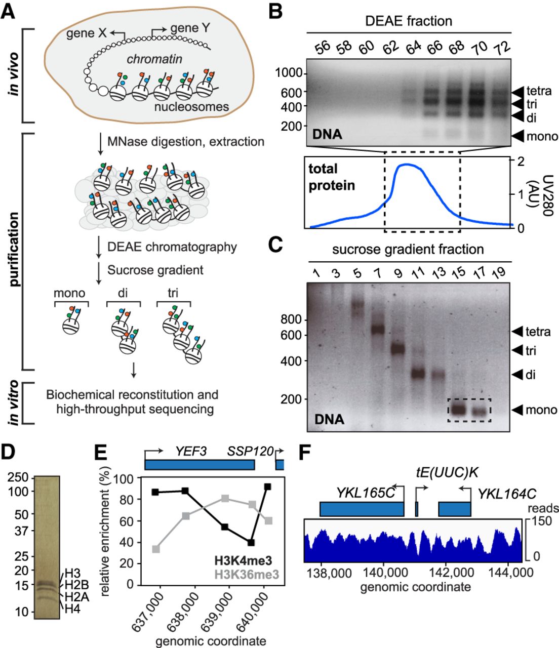 Purification and characterization of genomic chromatin. (A) Schematic of experimental approach. Colored circles, histone marks. (B) DNA from DEAE fractions analyzed by agarose gel electrophoresis (top panel); marker on left shows length in bp. Bottom panel, chromatogram of total eluted protein. Fractions 66–72 were loaded on the sucrose gradient. (C) DNA from sucrose gradient analyzed by agarose gel electrophoresis. Fractions used for experiments are indicated by stippled box. (D) Silver-staining of purified mononucleosomes from C. (E) Histone mark patterns of purified mononucleosomes as determined by native ChIP-qPCR. Histone marks were normalized to histone H3, as in the reference data sets of Pokholok et al. (2005) and Kim and Buratowski (2009). (F) Representative map of nucleosomes on Chromosome XI after paired-end sequencing and alignment to the yeast genome.