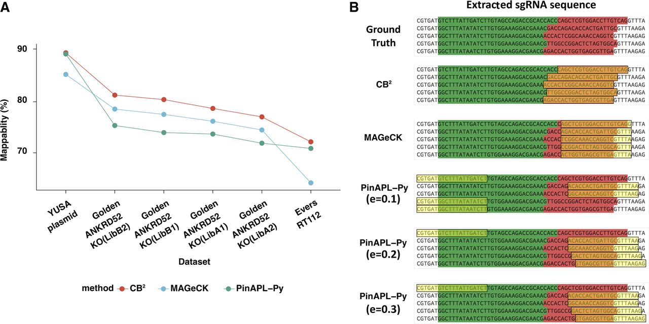 CB2 outperforms MAGeCK and PinAPL-Py in the percentage of mapped reads over six benchmark data sets. (A) Read mappability of CB2, MAGeCK, and PinAPL-Py across six different data sets. (B) Representative examples of reads that were not mapped by MAGeCK or PinAPL-Py. Adapters are highlighted with green; sgRNAs, with red. Yellow boxes show the predicted locations of sgRNAs by each method. Several parameters were used to optimize performances of PinAPL-Py.