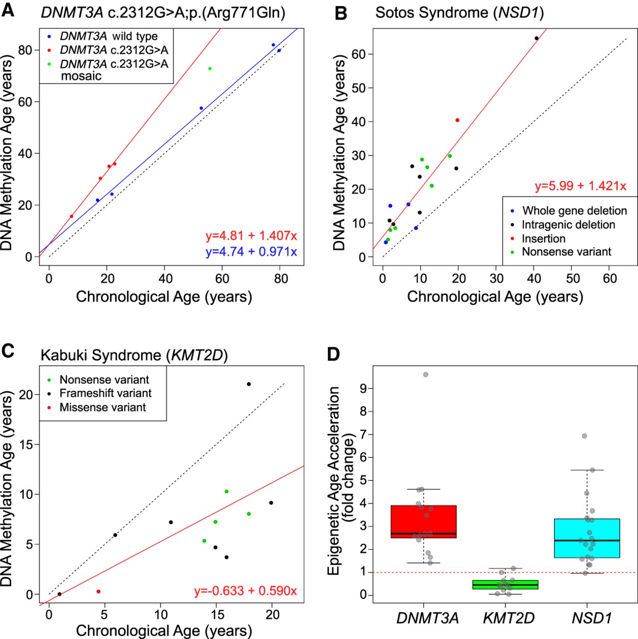 Altered epigenetic aging is observed in methyltransferase-associated human growth disorders. (A) Scatter plot comparing “DNA methylation age” derived from the Illumina 450K data (y-axis) and actual chronological age (x-axis) in DNMT3A c.2312G > A p.(Arg771Gln) pathogenic variant carriers (red) versus wild-type family members (blue). Green indicates the mosaic individual. The linear regression model is also shown. (B) Scatter plot comparing DNA methylation age versus chronological age in patients with Sotos syndrome. In-frame legend illustrates the different NSD1 pathogenic variants studied. (C) Scatter plot comparing DNA methylation age versus chronological age in patients with Kabuki syndrome. In-frame legend illustrates the different KMT2D pathogenic variants studied. (D) Boxplot comparing the epigenetic age acceleration rates found in association with TBRS DNMT3A variants, KMT2D Kabuki syndrome variants, and NSD1 Sotos syndrome variants. Each age acceleration observation is plotted as a circle. The dotted red line denotes no age acceleration.