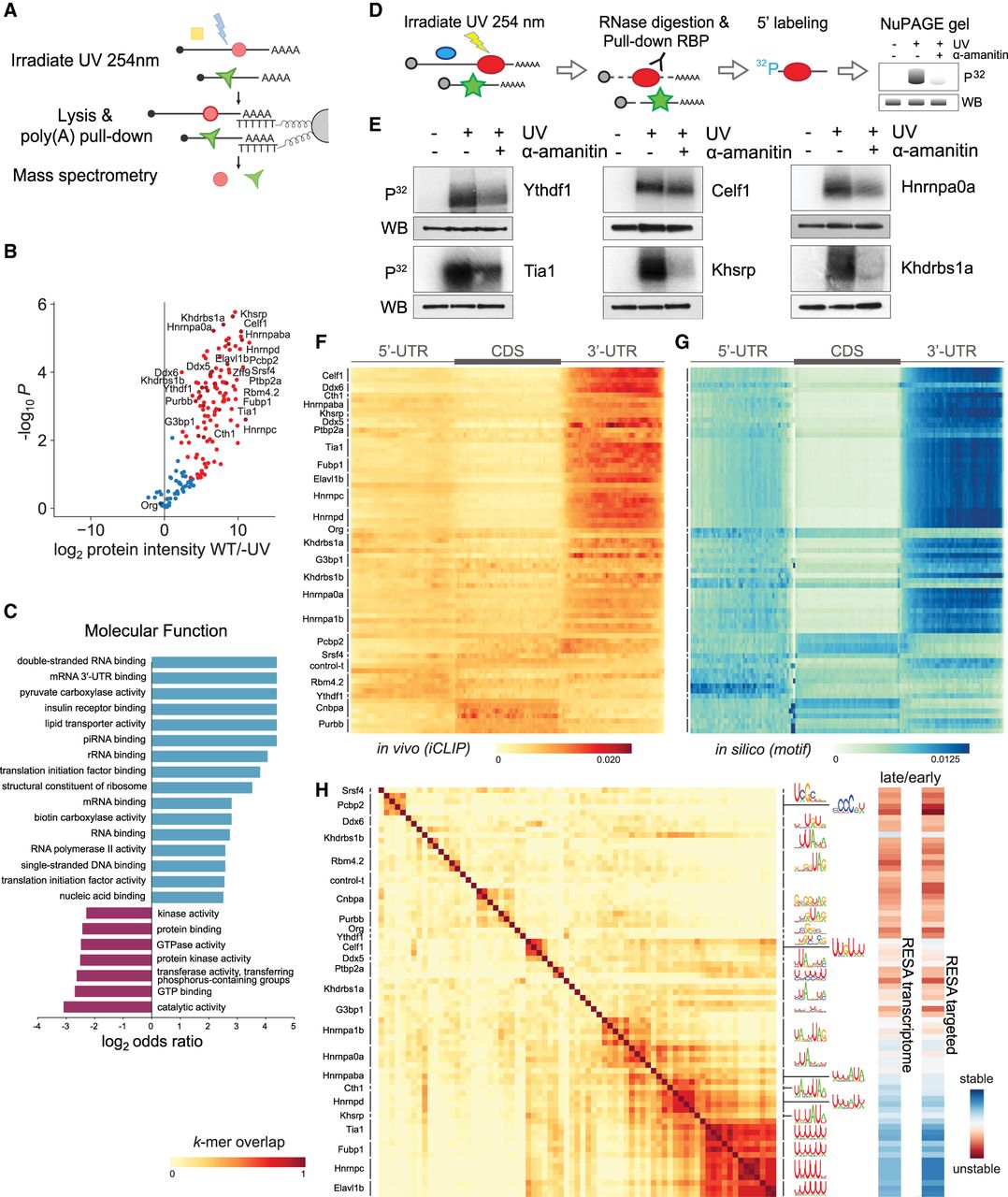 Mapping RNA-interacting factors in the embryo and identifying putative regulatory factors driving mRNA stability. (A) Diagram summarizing the interactome capture protocol. After UV crosslinking and poly(A) mRNA pull-down, RBPs are identified using mass spectrometry. (B) Volcano plot showing the RBPs significantly enriched over background by interactome capture. (C) GO term enrichment analysis characterizing the molecular functions of the captured proteins. (D) Cartoon depicting the rationale behind a label-transfer experiment to validate RNA–protein interactions. P32 autoradiograph indicates the amount of RNA, whereas while FLAG western blot indicates RBP levels. (E) Validation of the RNA-binding activity during zebrafish development of representative RPBs identified in the interactome capture. (F) Heatmap representing iCLIP metaplots of RBP binding within protein-coding transcripts. The UTRs and CDS of each transcript were split into 50 bins to normalize their length. Metaplots averaged over each RBP were clustered to group similar binding profiles. (G) Heatmap representing in silico binding profiles obtained by scanning for RBP binding motifs within protein-coding transcripts. Motifs are represented in H. (H) Heatmap illustrating the overlap among RBP binding motifs. Motifs were characterized using the top 20 6-mers most bound normalized by iCLIP control. For example, two proteins with the same top 6-mers received a 1.0 overlap score and represented in dark red (left). RESA averaged coverage ratio for each motif (right).