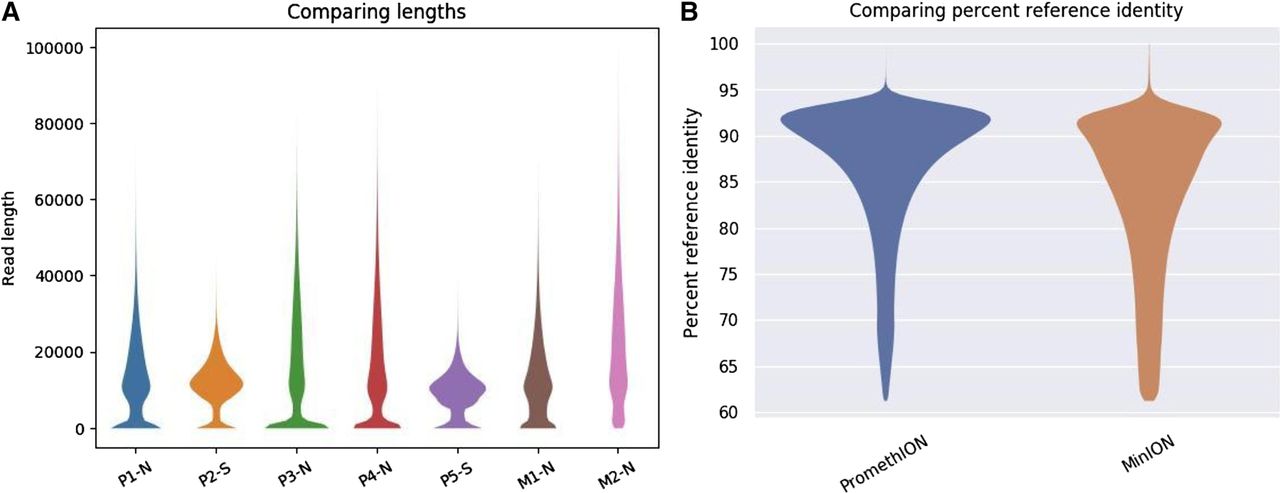 Comparison of PromethION and MinION libraries. (A) Read lengths capped at 100 kb. (B) Percentage of identity after minimap2 alignment to the reference genome. (P) PromethION; (M) MinION; (N) nonsheared/native; (S) sheared before library preparation. Plots were made using NanoPack (De Coster et al. 2018).