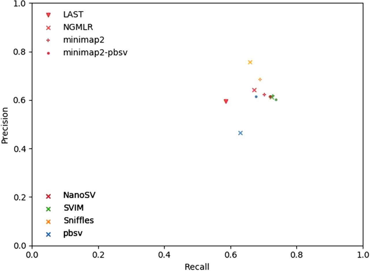 Precision-recall comparison. Aligners are tagged with symbols, variant callers with colors.