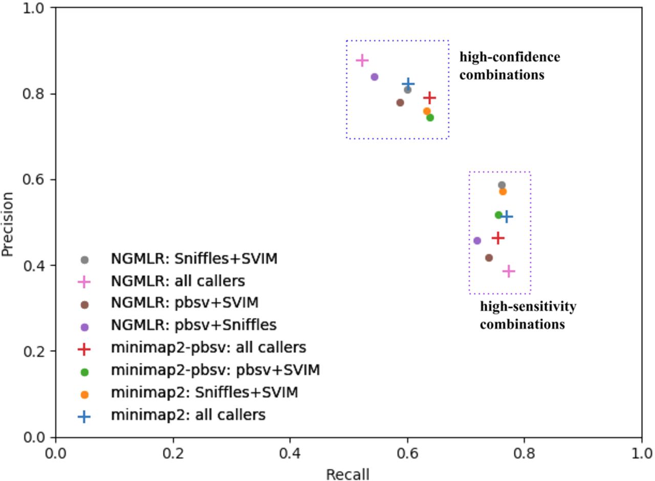 Precision-recall comparison of combined variant sets. Combination of all compatible variant callers per aligner are tagged with plus signs, pairwise combinations of variant callers with dots.