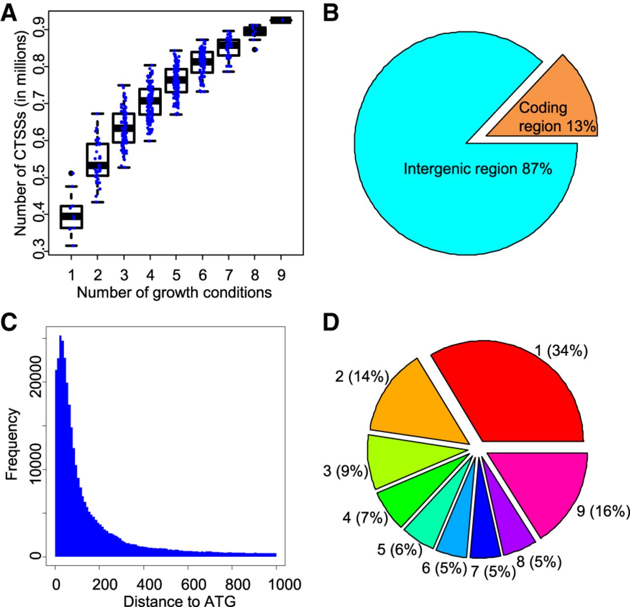 Pervasive and dynamic transcription initiation in S. cerevisiae. (A) Correlations between numbers of examined growth conditions and identified CTSSs. The x-axis indicates the number of examined conditions. Each dot in the box plots represents the number of identified CTSSs based on a combination of TSS data from N numbers (ranging from 1 to 9) of growth conditions. (B) Distribution of mapped CAGE tags in different genomic regions. (C) Distribution of distance between CTSSs and annotated translation start codon (ATG). (D) Proportions of CTSSs identified in different numbers of growth conditions.