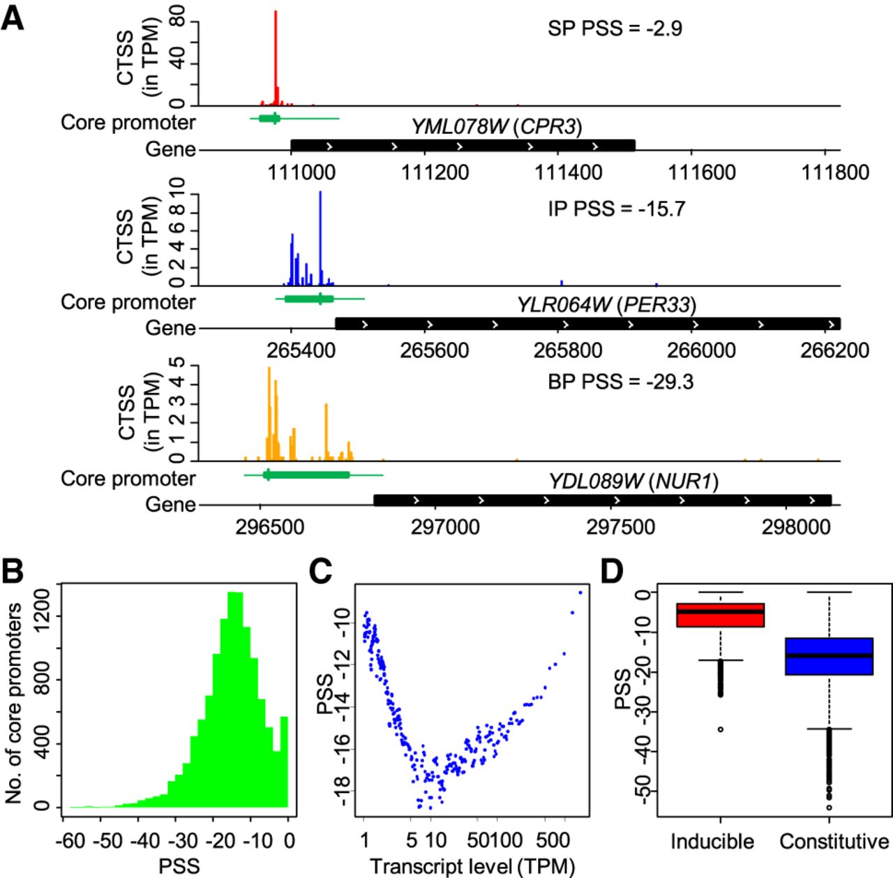 Classifications of core promoter shape. (A) Examples of sharp, intermediate, and broad core promoters in S. cerevisiae. Core promoters with PSS greater than −10 were classified as sharp core promoters (SP), smaller than −20 as broad core promoters (BP), and the others as intermediate core promoters (IP). (B) Histogram shows the distribution of PSS values in S. cerevisiae. (C) Relationships between the transcript abundance and PSS values of core promoters. The dot plot was generated using a sliding window analysis after sorting all core promoters by transcript abundance (TPM). Each window has 200 core promoters with a moving step of 40 core promoters. Each dot presents the median values of PSS and TPM of each window. (D) A box plot of PSS values of inducible core promoters and constitutive core promoters.