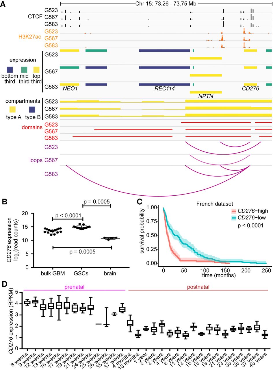 CD276 is an immune gene with elevated expression in GSCs. (A) 3D genome and chromatin landscape at the CD276 locus. This panel integrates CTCF ChIP-seq, H3K27ac ChIP-seq, RNA-seq, compartments (50-kb), domains (10-kb), and loops (union of 5-, 10-, and 25-kb calls) determined by Hi-C for three patient-derived GSC cultures (G523, G567, and G583). (B) Expression of CD276 was determined by RNA-seq in bulk GBM samples (n = 76), GSCs (n = 76), and non-neoplastic brain tissue (n = 4). P-values were calculated with the Mann–Whitney U statistical test. (C) Survival of glioma patients stratified by CD276 expression in the French data set. Median gene expression was used to stratify patients. P-value was derived with log-rank statistics. Shading around curve indicates 95% confidence interval. (D) Patterns of expression of CD276 in the prenatal and postnatal human brain. Data were extracted from BrainSpan.