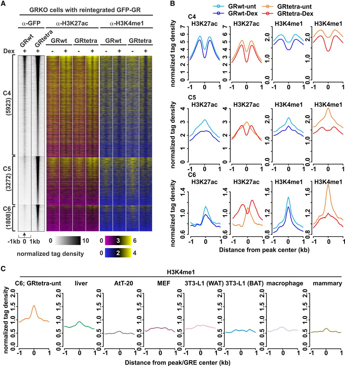 Active and poised enhancer marks at GRtetra binding sites. (A) ChIP-seq data of H3K27ac and H3K4me1 at clusters C4–C6. GR binding is represented as in Figure 1A. A two-color binding intensity scale is used for the histone modification data on a linear scale. (B) Aggregate plots represent histone modification changes for each cluster; color indicates treatment and GR type. (C) Aggregate plots show the comparison of GRtetra H3K4me1 enrichment in untreated cells at C6 sites to GR binding sites present in other cell lines not shared with GRtetra cells. AtT-20 (pituitary), mouse embryonic fibroblast (MEF), and 3T3-L1 differentiated toward white (WAT) or brown (BAT) adipose tissue. Peaks used in the analyses harbored a GRE at the center of the peak.
