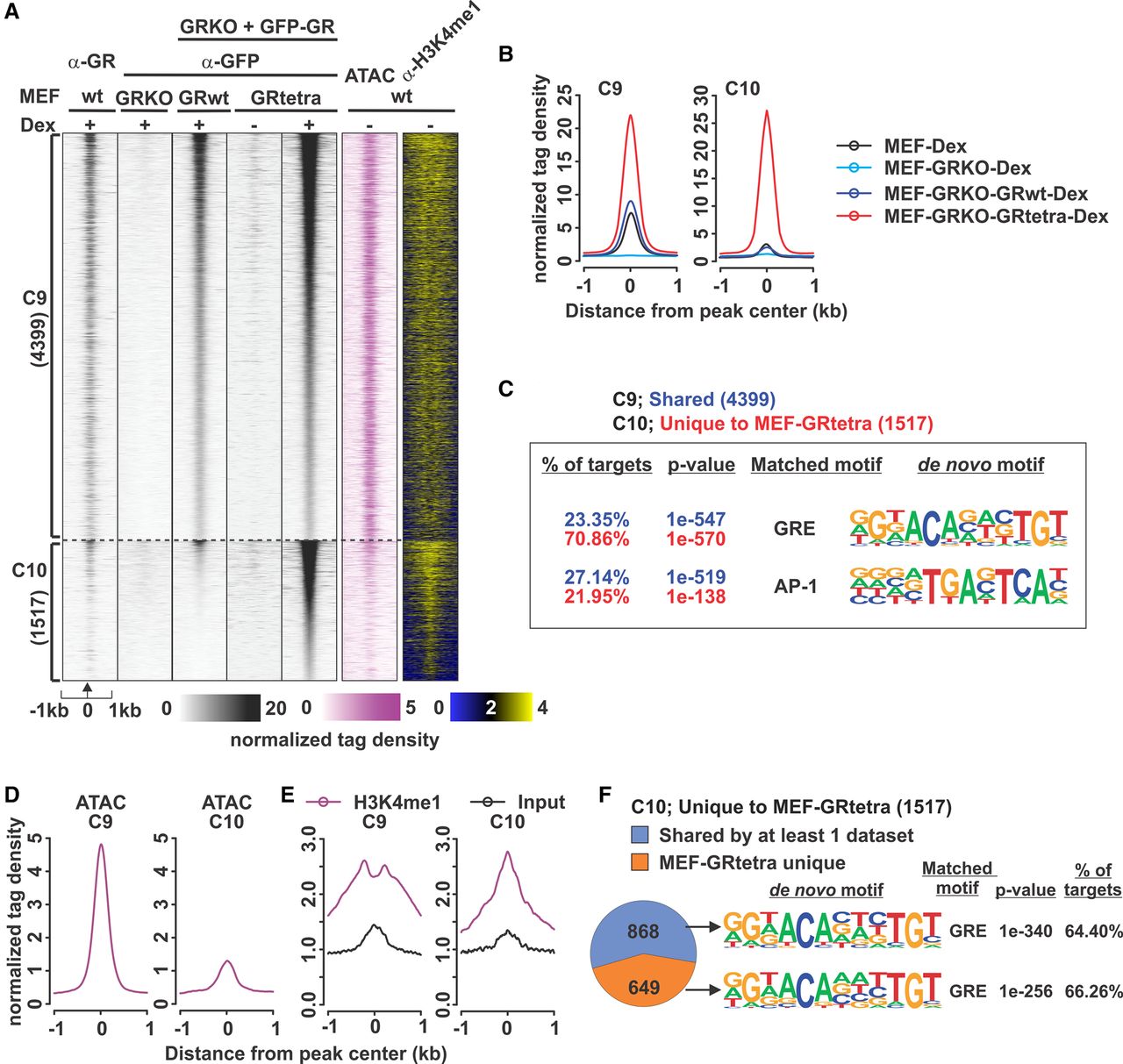 Properties of GRtetra are retained in MEFs. (A) Comparison of endogenous GR in MEFs, reintroduced GRwt, and GRtetra binding in GRKO MEFs reveals two clusters, C9 (shared by MEF-GRwt and MEF-GRtetra) and C10 (MEF-GRtetra–specific sites). Each heat map represents ±1 kb around the center of the GR peak. Binding intensity scale is noted below on a linear scale. A two-color binding intensity scale is used for the histone modification data. Heat maps are sorted based on MEF-GRtetra GFP ChIP-seq binding intensity. (B) Aggregate plots of +Dex GR binding (anti-GFP, or anti-GR for wild-type MEFs) for each cluster; color indicates cell type with endogenous GR, GRKO, or MEFs expressing GRwt or GRtetra. (C) De novo motif analysis as in Figure 1B. Full list of enriched de novo motifs is shown in Supplemental Table S2. (D) Aggregate plots of ATAC-seq tag density in untreated MEFs for each GR binding cluster. (E) Aggregate plots of H3K4me1 ChIP-seq and input tag density in untreated MEFs for each GR binding cluster. (F) Pie chart showing C10 sites unique or shared with at least one published GR ChIP-seq data set. De novo motif analysis of the most enriched motif shown on the right.