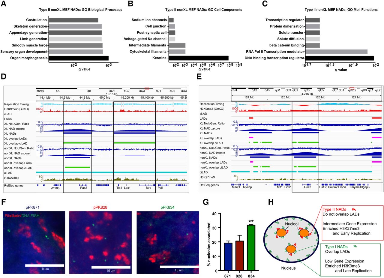 Type II NADs contain developmentally regulated genes and can be differentially localized in MEF and ES cells. (A) GO enrichment analysis of Type II NADs (nonXL). In this panel, the seven most significant Biological Processes annotations and Q-values are shown. (B) As in A, showing the Cell Components annotations. (C) As in A, showing the Molecular Functions annotations. (D) Analysis of specific loci, using the same Integrative Genomics Viewer (IGV) (Thorvaldsdóttir et al. 2013) session as in Figure 2, except that tracks showing NADfinder-derived Z-scores are also included. Genomic region showing two Type II NAD peaks (the one on the right achieved a statistical significance of Q < 10 × 10−3 only in the XL but not nonXL data). The peak on the left contains the Pax2 transcription factor gene. The peak on the right contains the Tlx1 and Lbx1 homeobox transcription factor genes. (E) As in D, showing a Type II peak containing the Grik3 glutamate receptor gene. (F) Single optical sections of confocal microscopy images of 3D FISH analysis of mouse D3 ES cells. BAC DNA probes are labeled in green, fibrillarin in red, and the scale bar is 10 μm. In MEFs, pPK871 is a negative control probe, pPK828 is a Type II NAD, and pPK834 is a Type I NAD (see Fig. 3). (G) Quantification of D3 mES cell DNA-FISH. Graph (left), percentage of alleles from the indicated probes associated with nucleoli (mean ± SEM). Welch's t-tests for difference from pPK871: (**) pPK834 (P = 0.0018); pPK828 (P = 0.62). (H) A diagram that summarizes the distinct characteristics of Type I and II NADs.