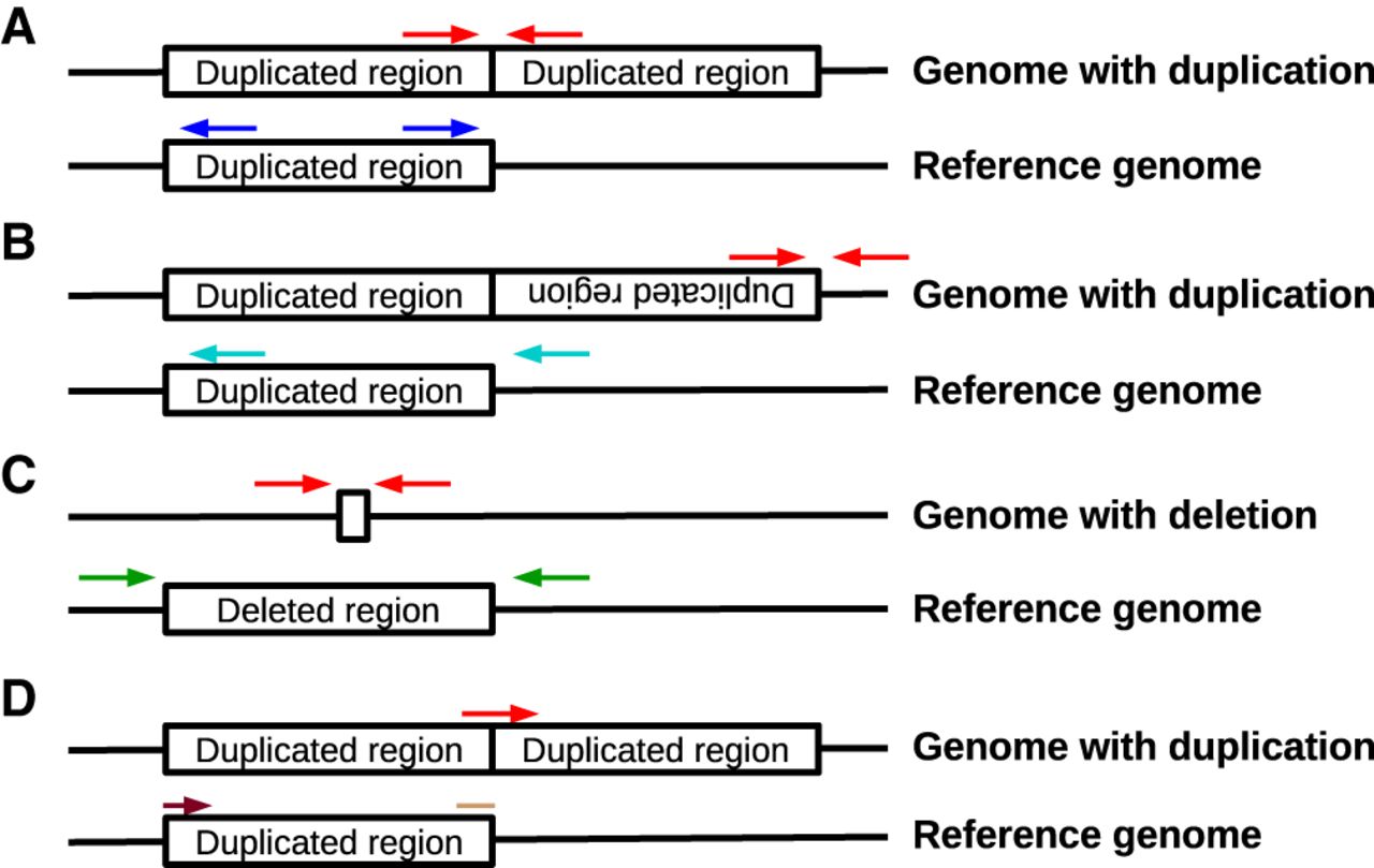 Three types of discordant read pairs (A–C) and breakpoint reads (D) were used to identify different CNV alleles. (A) In tandem duplications, read pairs derived from segments spanning the CNV breakpoint (red arrows) align facing away from each other around the breakpoint on the reference genome (dark blue arrows). (B) In tandem inversions, read pairs derived from segments spanning the end of the inverted segment (red arrows) align facing in the same direction as each other around the breakpoint on the reference genome (cyan arrows). (C) In deletions, read pairs derived from segments spanning the deleted sequence (red arrows) align in the correct orientation around the breakpoint, but farther apart than expected given the insert size of the sequencing library (green arrows). (D) In any of the aforementioned types of CNV (tandem duplication shown here as an example), reads crossing the breakpoint (red arrow) will only partially align on either side of the breakpoint. For the tandem duplication shown here, the start of the read (light brown start of an arrow) aligns at the end of the duplicated region, whereas the end of the read (dark brown end of an arrow) aligns at the start of the duplication.
