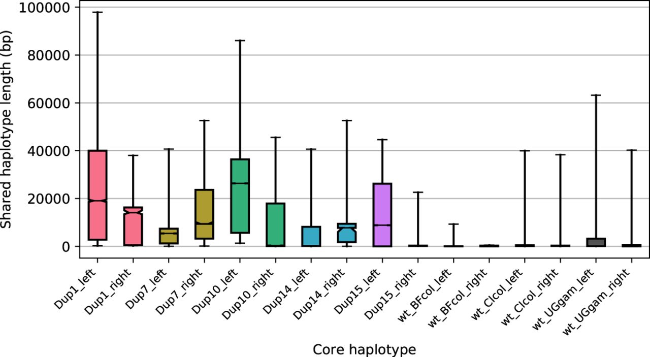Lengths of pairwise shared haplotypes are greater between samples sharing a CNV allele than between wild-type samples. Shared haplotype lengths were calculated on either side of the CNV-containing region of the Cyp6aa/p gene cluster. Non-CNV (WT) samples were taken from the same populations as the focal CNV alleles. Bars show the distribution of shared haplotype lengths between all haplotype pairs with the same core haplotype. Bar limits show the interquartile range, fliers show the 5th and 95th percentiles, horizontal black lines show the median, and notches in the bars show the bootstrapped 95% confidence interval for the median. The names of the CNVs (Cyp6aap_Dup#) are abbreviated as Dup#: (BF) Burkina Faso; (CI) Côte d'Ivoire; (UG) Uganda; (col) An. coluzzii; (gam) An. gambiae.