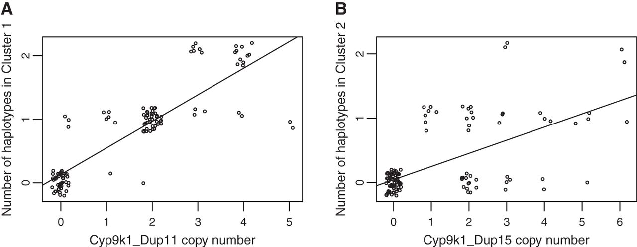 The two main haplotype clusters around Cyp9k1 in Burkina Faso, Ghana, and Guinea are associated with respective CNV alleles. Points are jittered to show overlapping data. Lines show least-squares regression through the data. (A) Strong correlation between Cyp9k1_Dup11 and haplotype Cluster 1. Most of the points lie on a line of slope 0.5, indicating that Cyp9k1_Dup11 is found most frequently as a triplication (two extra copies per chromosome), although both lower and higher copy number versions of this CNV exist. (B) Weaker correlation between Cyp9k1_Dup15 and haplotype Cluster 2.