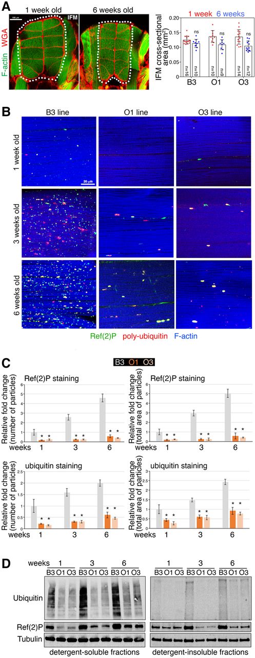 Modulation of muscle cross-sectional area and protein quality control in O and B lines during aging. (A) Changes in muscle size are variable and typically not significant during Drosophila aging. Sections of Drosophila thoraces from B3 flies at 1 and 6 wk stained with phalloidin, to detect F-actin (green), and with Alexa555-WGA (wheat germ agglutinin), to detect the extracellular matrix (red). Age-related changes in the cross-sectional area of the 12 longitudinal indirect flight muscles (IFM; outlined) are not statistically significant due to high variability (SD, n = 9–16). These findings indicate that muscle mass loss is not a robust feature of aging in Drosophila and that it does not differ between O and B lines. (B) Immunostaining of indirect flight muscle from the O and B lines reveals an age-related accumulation of Ref(2)P-positive (green) poly-ubiquitin (red) protein aggregates in the muscles of B3 flies, whereas this does not occur to the same extent in the O lines, as demonstrated by the quantifications shown in C, which report the number and total area of particles (protein aggregates) normalized by tissue area; (*) P < 0.05; n = 10–25; SEM. (D) Western blots of skeletal muscle fractions similarly indicate that there is a lower increase with aging of poly-ubiquitin protein aggregates in the muscles of the O lines compared to the B3 (ubiquitin and Ref[2]P signals detected in detergent-insoluble fractions), whereas there is no change in the ubiquitin and Ref(2)P levels detected in the detergent-soluble fractions.