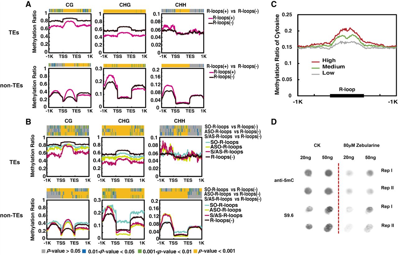 CG, CHG, and CHH methylation levels in TEs and non-TE genes in relation with R-loops. (A) Average ratios of CG, CHG, and CHH methylation between the TSS and TES and in ±1-kb flanking regions. Methylation ratios are shown with light red or black lines corresponding to genes with or without R-loops, respectively. The window size in flanking regions was 20 bp, and gene-body regions were equally divided into 50 bins for calculation of DNA methylation rates. The colored strips at the top of each plot reflect P-values from the Wilcoxon rank-sum test. Gray bands represent P-values > 0.05; blue bands, 0.05 < P-values < 0.01; green bands, 0.001 < P-values < 0.01; and yellow bands, P-values < 0.001. (B) As in A, except methylation ratios are shown with cyan, yellow, red, and black lines when the genes have SO-R-loops, ASO-R-loops, S/AS-R-loops, or no R-loops, respectively. (C) R-loop peak levels (high, medium, or low) and their corresponding total cytosine methylation ratios in rice. The window size in flanking regions was 20 bp, and all R-loop peaks were equally divided into 50 bins for calculating DNA methylation rates. (D) Dot blotting assays of normal and zebularine-treated plants with anti-5mC and anti-S9.6 antibodies. Each sample had two technical repeats in each blot. Dot signals were cut from the original blot that can be found in Supplemental Figure S10. Zebularine is known as a methylation inhibitor.