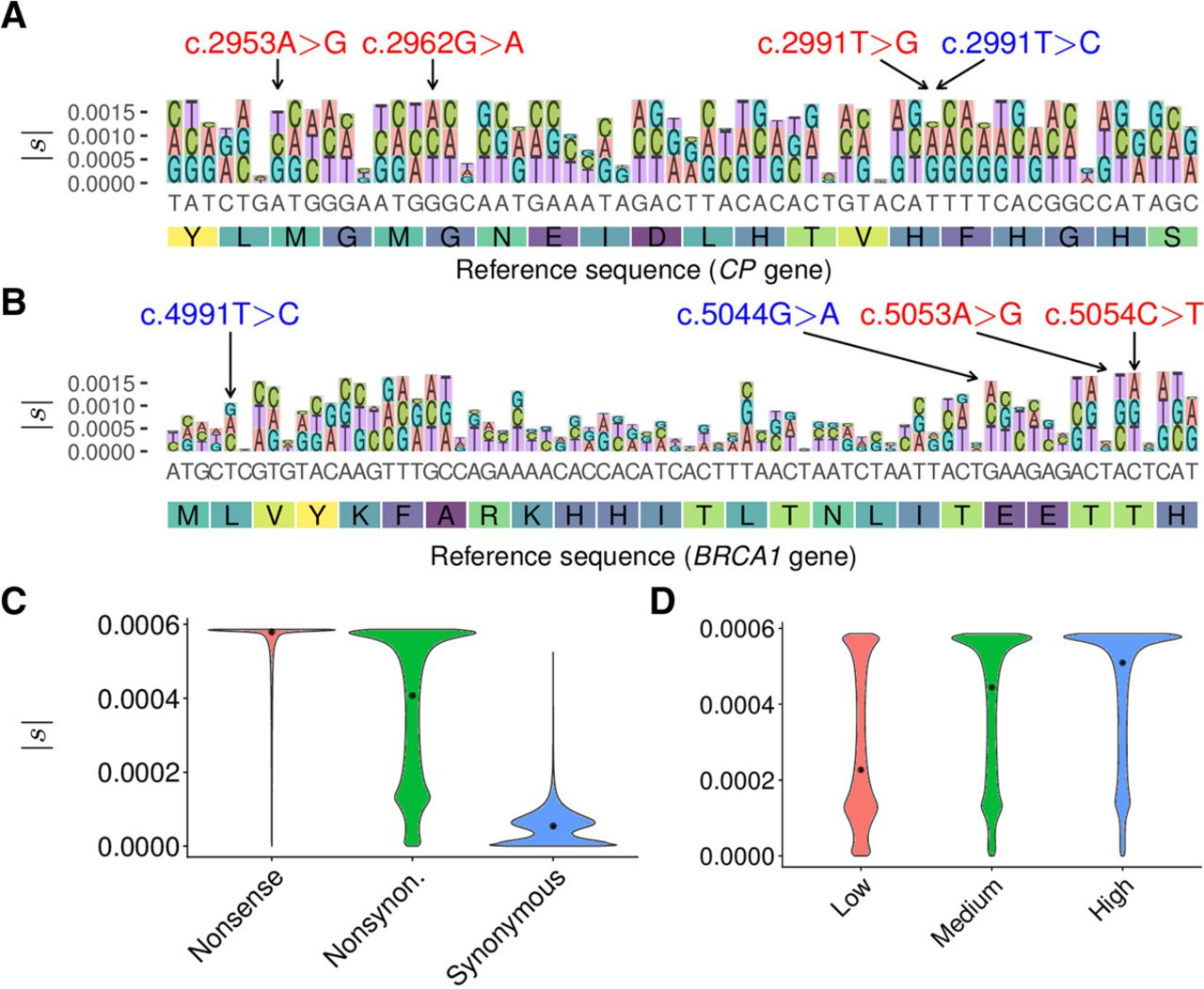 Distributions of selection coefficients estimated by LASSIE. (A) Variant-specific selection coefficients |s| estimated for all potential mutations in a 60-bp region in the CP gene. Nonreference alleles are distinguished by color and drawn with height proportional to |s|. The y-axis indicates cumulative |s|. The three nonsynonymous variants indicated at the top in red (c.2953A > G, c.2962G > A, and c.2991T > G) are associated with Mendelian diseases, and the synonymous variant indicated in blue (c.2991T > C) is benign. (B) Estimates of |s| for all potential mutations in a 72-bp region in the BRCA1 gene. The two nonsynonymous variants indicated at the top in red (c.5053A > G and c.5054C > T) are pathogenic, and the two nonsynonymous variants indicated in blue (c.4991T > C and c.5044G > A) are benign. (C) Distributions of estimated selection coefficients |s| for nonsense, nonsynonymous, and synonymous mutations. (D) Distributions of |s| for nonsynonymous mutations in genes expressed at low, medium, and high levels, based on tertiles of RNA-seq read counts from Roadmap Epigenomics data (Roadmap Epigenomics Consortium et al. 2015), showing a positive correlation between expression level and |s| (Spearman's rank correlation coefficient ρ = 0.338; P < 10−15, two-tailed t-test).