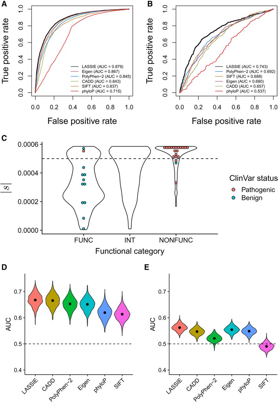 Performance in predicting disease-associated nonsynonymous variants. Performance is quantified using the area under the receiver operating characteristic curve (AUC) statistic. Results for LASSIE are compared with those for Eigen (Ionita-Laza et al. 2016), PolyPhen-2 (Adzhubei et al. 2010), CADD (Kircher et al. 2014), SIFT (Ng and Henikoff 2003), and phyloP (Pollard et al. 2010). (A) Performance for pathogenic variants from ClinVar (Landrum et al. 2014). (B) Performance for cancer-driver mutations from Chang et al. (2016). (C) Distributions of estimated |s| for variants in BRCA1 predicted to be “functional” (FUNC; i.e., nondisruptive), “intermediate” (INT), or “nonfunctional” (NONFUNC; i.e., disruptive) by saturation genome editing (Findlay et al. 2018). Colored dots indicate those variants also having expert-reviewed status in ClinVar (CLINREVSTAT = reviewed by expert panel). (D) Performance for rare (MAF < 1%) GWAS hits. (E) Performance for common (MAF > 5%) GWAS hits, showing that all methods have limited power.