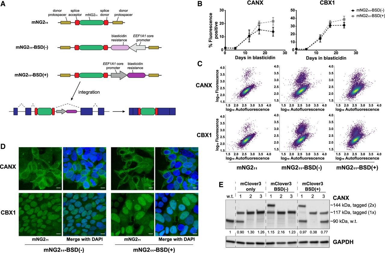 A modified donor allows for easy selection of tagged cells. (A) Schematic of donor constructs without and with a blasticidin resistance (BSD) gene. (B) Enrichment of fluorescence-positive HEK293 mNG21–10 cells tagged with mNG211-BSD(−/+) at CANX intron 14 and CBX1 intron 3 after blasticidin treatment. Data represent mean ± SEM (n = 3). (C) Dot plots of total HEK293 cell populations tagged with mNG211 or with mNG211-BSD(−/+) and selected for 12 d. Plots are colored by density. (D) Confocal microscopy of total cell populations as in C. Images are maximum projections of Z-stacks, and scale bars correspond to 10 µm. (E) Western blot of clonal HAP1 lysates tagged with mClover3 only or mClover3-BSD(−/+) at CANX intron 14, target 1. The values below the anti-CANX blot indicate total levels of the major CANX band (tagged and untagged) relative to levels in wild-type (w.t.) cells.