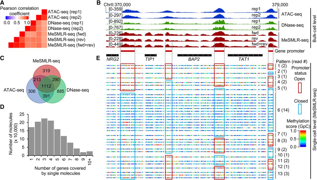Performance evaluation of MeSMLR-seq on bulk-level chromatin accessibility mapping, and single-molecule long-range mapping of chromatin accessibility. (A) Correlation of chromatin accessibility profiles generated by MeSMLR-seq, ATAC-seq, and DNase-seq. (B) Chromatin accessibility profiles at the bulk-cell level provided by MeSMLR-seq, ATAC-seq, and DNase-seq. (C) Overlap of the significantly accessible regions (peaks) called by MeSMLR-seq, ATAC-seq, and DNase-seq. (D) Number of genes covered by single sequencing molecules of MeSMLR-seq data under 2% glucose condition. (E) Single-molecule long-range mapping of chromatin accessibility by MeSMLR-seq. Each line represents a molecule. GpC site is labeled as a rainbow-color dot, with methylation score from 0 (blue) to 1.0 (red). Thirteen combinatorial patterns of the promoter status of four genes are shown with different numbers of supporting sequencing molecules/cells. A promoter was defined as “open” (highlighted by red box) if the methylation scores of the including GpC sites had a median value greater than 0.5, and “closed” (highlighted by blue box) otherwise.