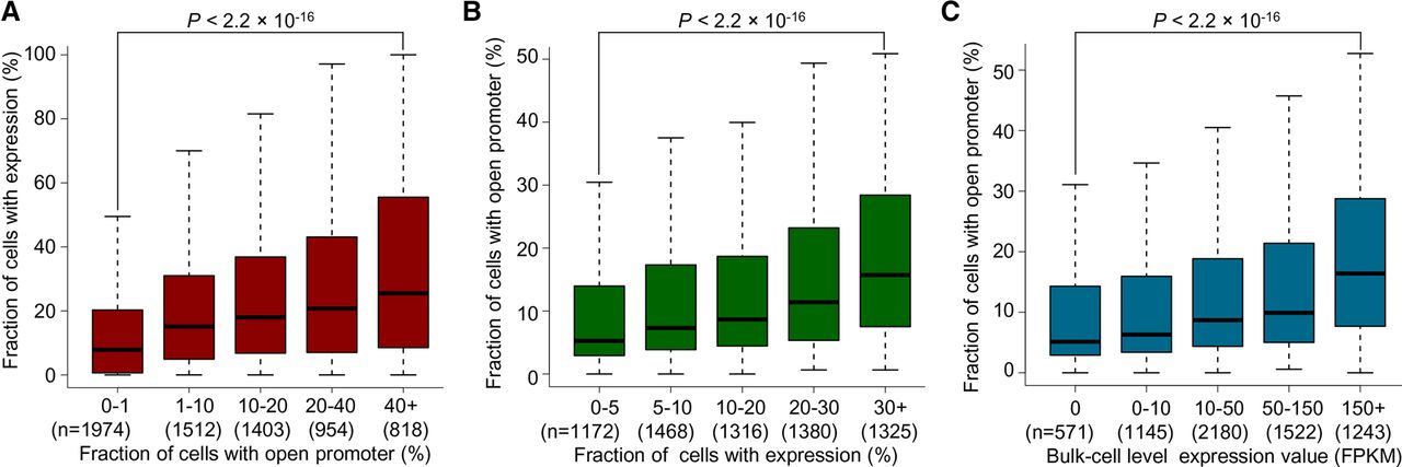 Quantitative relationship between chromatin accessibility and gene expression. (A,B) Quantitative relationship between chromatin accessibility and gene expression in a cell population. The former (A) was measured by the fraction of cells with an open promoter, and the latter (B) by the fraction of cells with expression (based on single-cell RNA-seq data). Genes were binned by one of the indices and the distribution of the other is shown. The gene was considered as “expressed” in a cell if the corresponding UMI (unique molecular identifier) count was ≥1. (C) Quantitative relationship between the bulk-cell gene expression and the cell population ratio of an open promoter. Genes were binned based on the bulk-cell gene expression level (RNA-seq data).