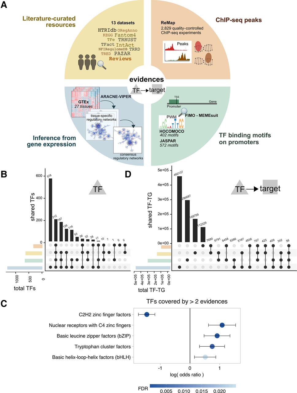 TF–target resources overview. (A) Summary of the resources and strategies used to derive human TF–target interactions classified according to the evidence level: manually curated resources (yellow), ChIP-seq binding experimental data (orange), prediction of TF binding motifs based on gene promoter sequences (green), or inference from GTEx data (blue). All the resources were used in the benchmark, except NFIRegulomeDB, which has too low coverage. (B) TF coverage and overlaps across the different evidence classes, represented via UpSet plots (Lex and Gehlenborg 2014). Left bar plot represents the total number of TF per evidence class. Top bar plot represents the number of overlapping TFs in the intersection. Dark circles in the matrix indicate the evidence class that is part of the intersection. (C) TF classes (from TFClass) enriched in the TFs covered by more than two lines of evidence. Dots indicate the log odds ratio; error bars, the confidence interval. Colors indicate the FDR. (D) UpSet plot representing the TF–target's coverage and overlaps across the different evidence classes (similar as in B). Note that for regulons inferred from GTEx, only TF–targets or three or more tissues are shown. For TFBSs and ChIP-seq, only top 500 unique hits are shown; P < 0.0001.