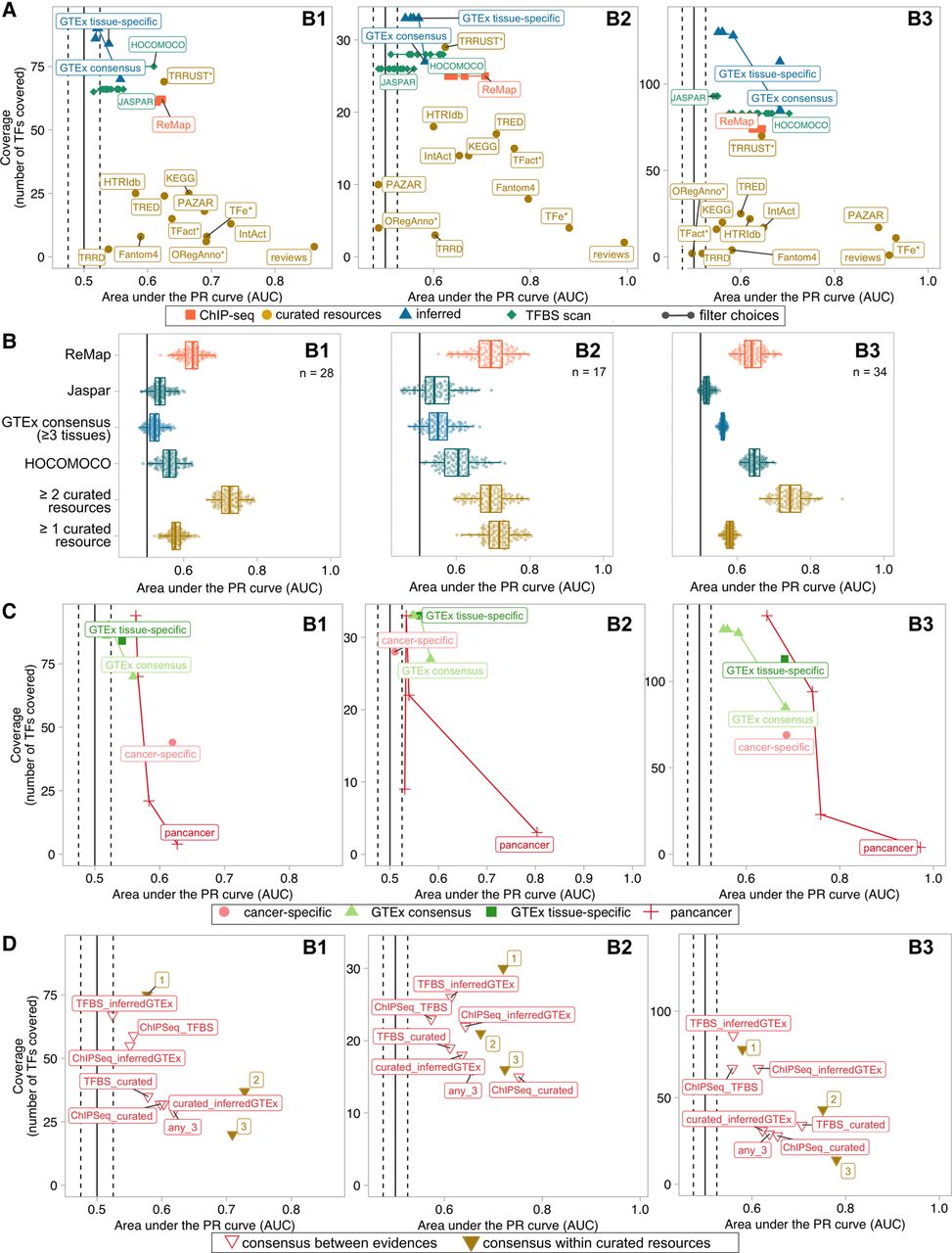 Comparison of TF activity prediction performances by TF–target resource for each benchmark data set. (A) Performance comparison of the regulon data sets, in terms of TF activity prediction, against the three benchmark data sets. Confidence versus coverage plots in which the x-axis represents the average AUPRC from the activity rank's position of the perturbed/essential TF with respect to the negative controls; y-axis represents the number of TFs (with five or more targets) in the benchmark covered by each regulon data set. Dot colors indicate the evidence type (single data sets/evidence). Linked dots represent different filtering strategies in the generation of transcriptionally inferred and TFBS-derived regulons. (B) Performance comparison of the regulon data sets on the overlapping TFs. The x-axis indicates the AUPRC from the activity rank's position of the perturbed/essential TF against the same number of randomly selected negatives; y-axis represents the regulon data set. The number of overlapping TFs is indicated at the top right corner. (C) Similar to A but comparing GTEx-inferred (green) versus TCGA-inferred (red) regulons. Results for both tissue/cancer-specific (dark color) and the respective normal and pancancer consensus regulons (light) are shown. (D) Similar to A but here the regulons are built as a combination of the initial regulon data sets (i.e., TF–target supported by an agreement of two (or three) of any of the four mentioned strategies). Dot colors indicate the nature of the combination (combined evidence). The label accompanying the “consensus within curated resources” dots indicates the number of resources supporting the TF–target interaction.