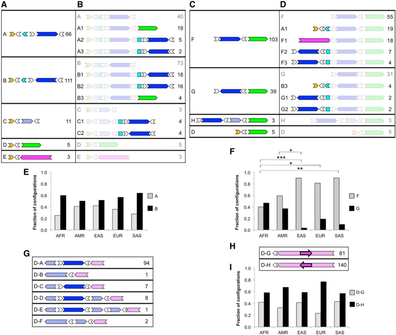 LCR22A and LCR22D configurations across a diverse control data set observed using Bionano optical mapping. Diagrams depict order and orientation of observed duplicons as defined in Figure 1. Minimal (A) and extended (B) configurations anchored in unique sequences upstream of LCR22A. Minimal (C) and extended (D) configurations anchored in unique sequence downstream from LCR22A. (E) Observed occurrences for upstream-anchored LCR22A configurations A and B in different populations. (F) Observed occurrences of downstream-anchored LCR22A configurations F and G in different populations. (G) Configurations anchored in unique sequence upstream of LCR22D. (H) Configurations anchored in unique sequence downstream from LCR22D. (I) Observed occurrences of downstream-anchored LCR22D configurations D–G and D–H in different populations. For each configuration in A–D and G–H, the ID is on the left, and the number of times that configuration was observed in the data set is on the right. Duplicons for which an orientation could not be determined are represented as squares. (AFR) African; (AMR) American; (EAS) East Asian; (EUR) European; (SAS) South Asian; (*) P < 0.05; (**) P < 0.01; (***) P < 0.001, Fisher's exact test, adjusted. Pairs of populations without asterisks in E, F, and I were not significantly different at P < 0.05.