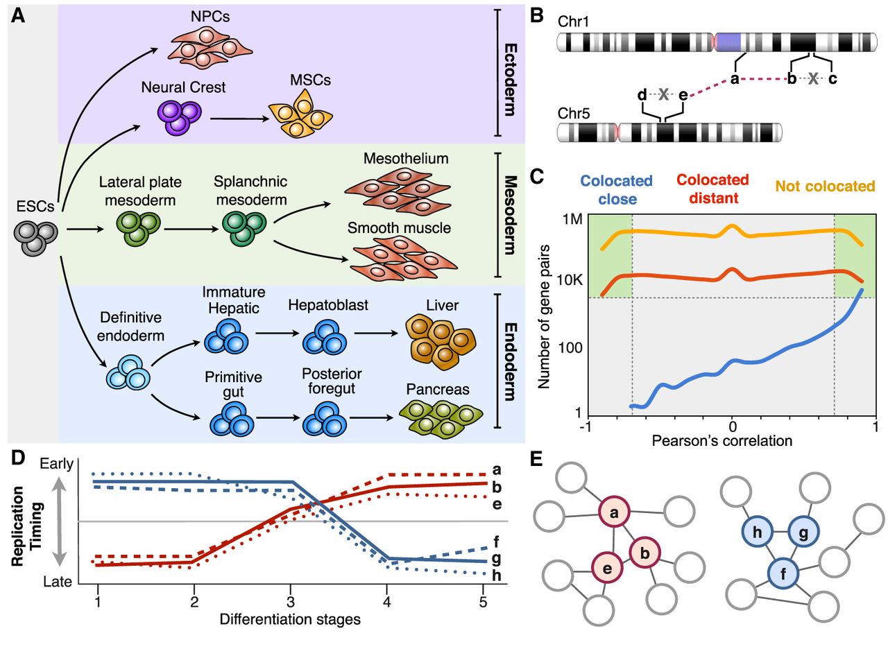 Coordinated changes in RT can be exploited to construct gene regulatory networks. (A) RT programs of distinct cell types representing intermediate stages of human embryonic stem cell differentiation toward endoderm, mesoderm, and ectoderm were analyzed for the construction of RT regulatory networks. (B) Depiction of different highly RT-correlated genes from distinct chromosomes and the establishment of network interaction edges between them. From all possible combinations of gene pairs, those colocated within 500 kb were removed from the analysis to include exclusively distal gene interactions. Regulatory interactions (edges) between gene pairs are considered only for genes located >500 kb apart (colocated distant) or in distinct chromosomes (not colocated); that is, edges between genes b-c and d-e were not included in the analysis. (C) Number of gene pairs as function of RT correlation for distinct categories of gene pairs: colocated close (within 500 kb), colocated distant (separated by >500 kb), and not colocated (from different chromosomes). Only gene pairs with significant RT correlations and located at least 500 kb apart were considered. (D) RT patterns of distinct hypothetical genes during five distinct differentiation intermediate stages (distinct number of differentiation intermediates were used from each pathway). (E) Construction of RT regulatory networks based on the significant Pearson's correlation (distance between nodes are proportional to the correlation strength).