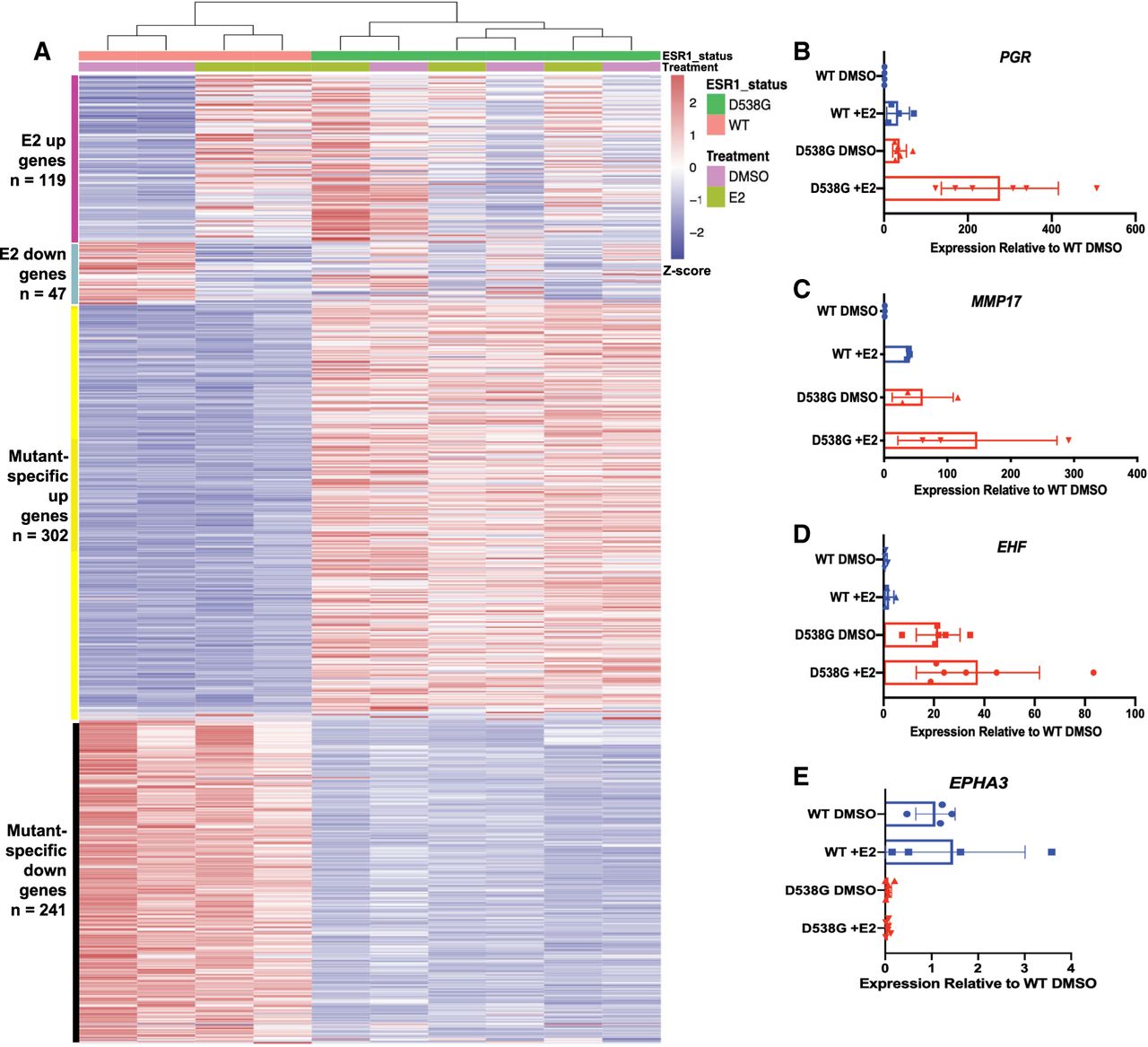 D538G mutant drives a distinct transcriptional program. (A) Heatmap shows the relative expression of E2 up- and down-regulated genes as well as mutant-specific differentially expressed genes. Sample types are indicated by the column annotations described in the legend. Validation of RNA-seq results by qPCR are shown for ligand-independent E2–up-regulated genes PGR (B) and MMP17 (C) as well as mutant-specific up-regulated gene EHF (D) and down-regulated gene EPHA3 (E). B–E show average expression levels, normalized to wild-type cells without E2 treatment, for two ESR1 wild-type and three D538G mutant clones after 8-h E2 or DMSO (vehicle) induction. Error bars represent SEM.