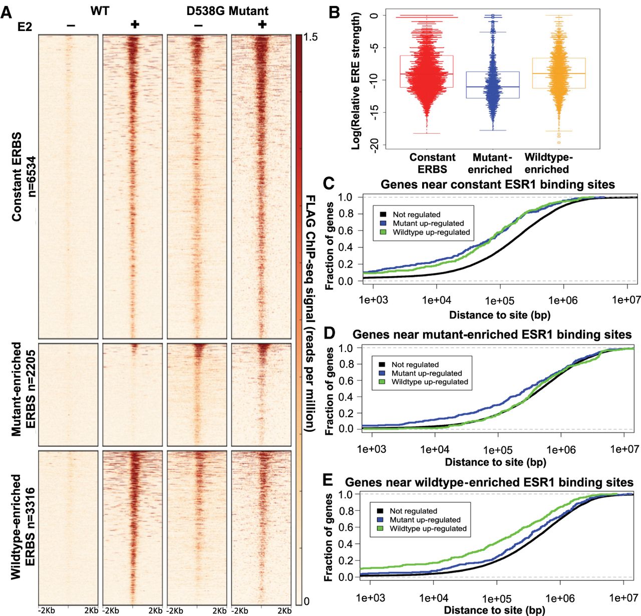 D538G mutation alters ESR1 genomic binding. (A) Heatmap displays ESR1 binding in representative wild-type and D538G mutant clones, in which each row is an ESR1 binding site. The heatmaps include sites that are constant in wild-type and mutant lines (top), sites that are enriched in the mutant lines (middle), and sites that are enriched in wild-type lines (bottom). (B) Plot shows that the distribution of the predicted relative affinity for ESR1, based on the best match to an ERE, is higher in constant binding sites (red) and wild-type–enriched sites (yellow) than D538G mutant-enriched ESR1 binding sites (blue). Cumulative distribution plots show the fraction of mutant up-regulated, down-regulated, or not regulated genes that have a constant (C), mutant-enriched (D), or wild-type–enriched (E) ESR1 binding site within a given distance from the transcription start site.