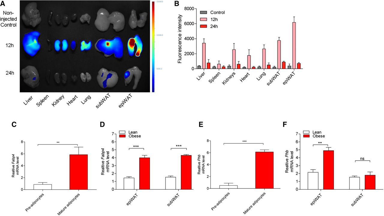 Epididymal adipose tissue targeting of (dCas9/sgFabp4) + ATS-9R oligoplexes. (A) Biodistribution image of intraperitoneally injected (dCas9/sgFabp4) + ATS-9R oligoplexes at 12 and 24 h postinjection. (B) Mean fluorescence intensity in various organs. Adipocytes were differentiated into mature adipocytes for in vitro analysis. For in vivo studies, 6-wk-old male C57BL/6 mice were fed on standard chow or a high-fat diet for 11 wk. Total RNAs were extracted and relative mRNA levels were determined by real-time PCR. Fabp4 mRNA was increased in the mature adipocytes (C) as well as both in the epidydimal white adipose tissue (epiWAT) and subcutaneous white adipose tissue (subWAT) of obese mice (D). Phb mRNA levels also increased in (E) mature adipocytes and (F) obese epiWAT. Data are presented as mean ± SEM. (n = 4–5). (ns) nonsignificant, (**) P < 0.01, (***) P < 0.001 was considered significant.