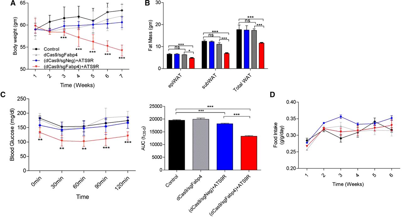 CRISPRi repression of Fabp4 in a high-fat diet-induced mouse model. (A) Weekly body weight. (B) Fat masses for epiWAT, subWAT, and total white adipose tissue. (C) Insulin tolerance test after 6 wk of treatment. Insulin was injected intraperitoneally and blood glucose was detected at each time point, and AUC was determined. (D) Weekly food intake. Data are presented as mean ± SEM (n = 3–5). (ns) nonsignificant, (*) P < 0.05, (**) P < 0.01, (***) P < 0.001 was considered significant.