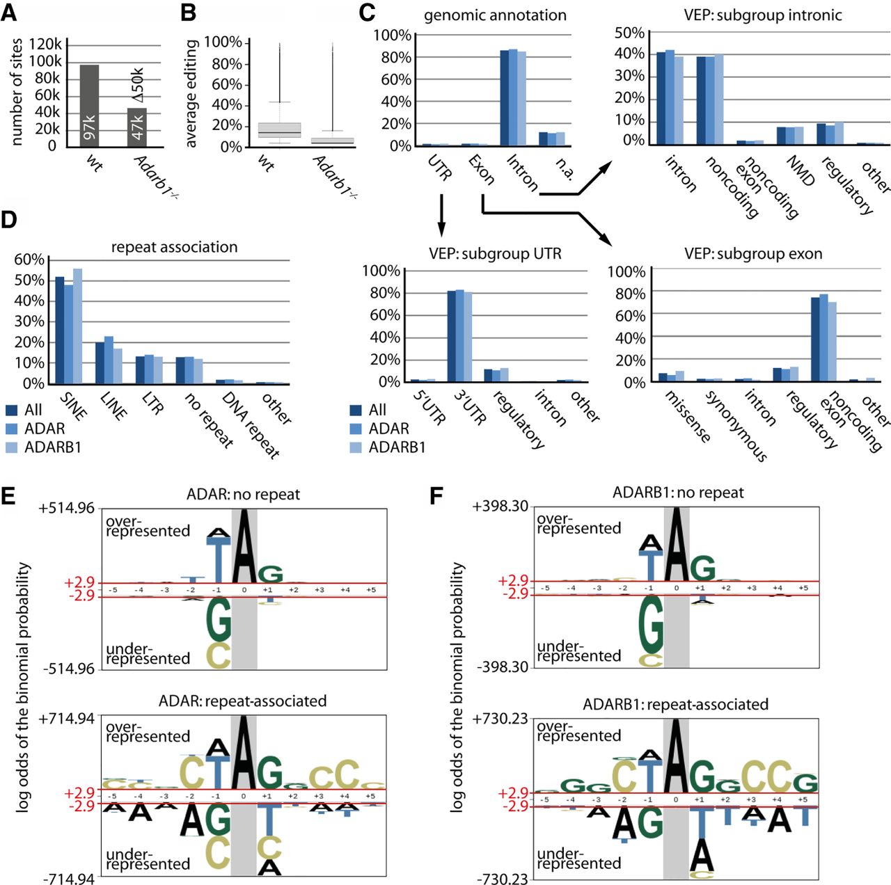 Both ADAR- and ADARB1-mediated editing is primarily associated with intronic regions and repeat elements. (A,B) Adarb1 deletion leads to an ∼60% reduction in editing activity. (A) The total number of editing sites is shown separately for wild type and Adarb1−/− (sites edited by ADAR). (B) The average editing level of all identified editing sites is plotted for wild type and Adarb1−/− (overall ADAR editing activity). Error bars = standard deviation. n = 3. (C) The genomic annotation for all sites (dark blue), ADAR sites (blue), and ADARB1 sites (light blue) is given (Exon, Intron, UTR, [n.a.] not annotated/intergenic). In addition, for the subgroups Exon, Intron, and UTR, the predicted effect of editing is given using Ensembl's variant effect predictor (VEP). VEP terms: intron variant (intron); noncoding transcript variant (noncoding); noncoding transcript exon variant (noncoding exon); NMD transcript variant (NMD); regulatory region (regulatory); 5′ or 3′ UTR variant (5′ or 3′ UTR); missense variant (missense); synonymous variant (synonymous). (D) The percentage of editing sites associated with a particular repeat as identified by RepeatMasker is shown. Colors as in C. (E,F) Sequences enriched close to editing sites not associated with repeat elements (upper panel) or associated with repeat elements (lower panel) depicted separately for (E) ADAR or (F) ADARB1. The height of the nucleotide indicates either the degree of overrepresentation (above the line) or the degree of underrepresentation (below the line).