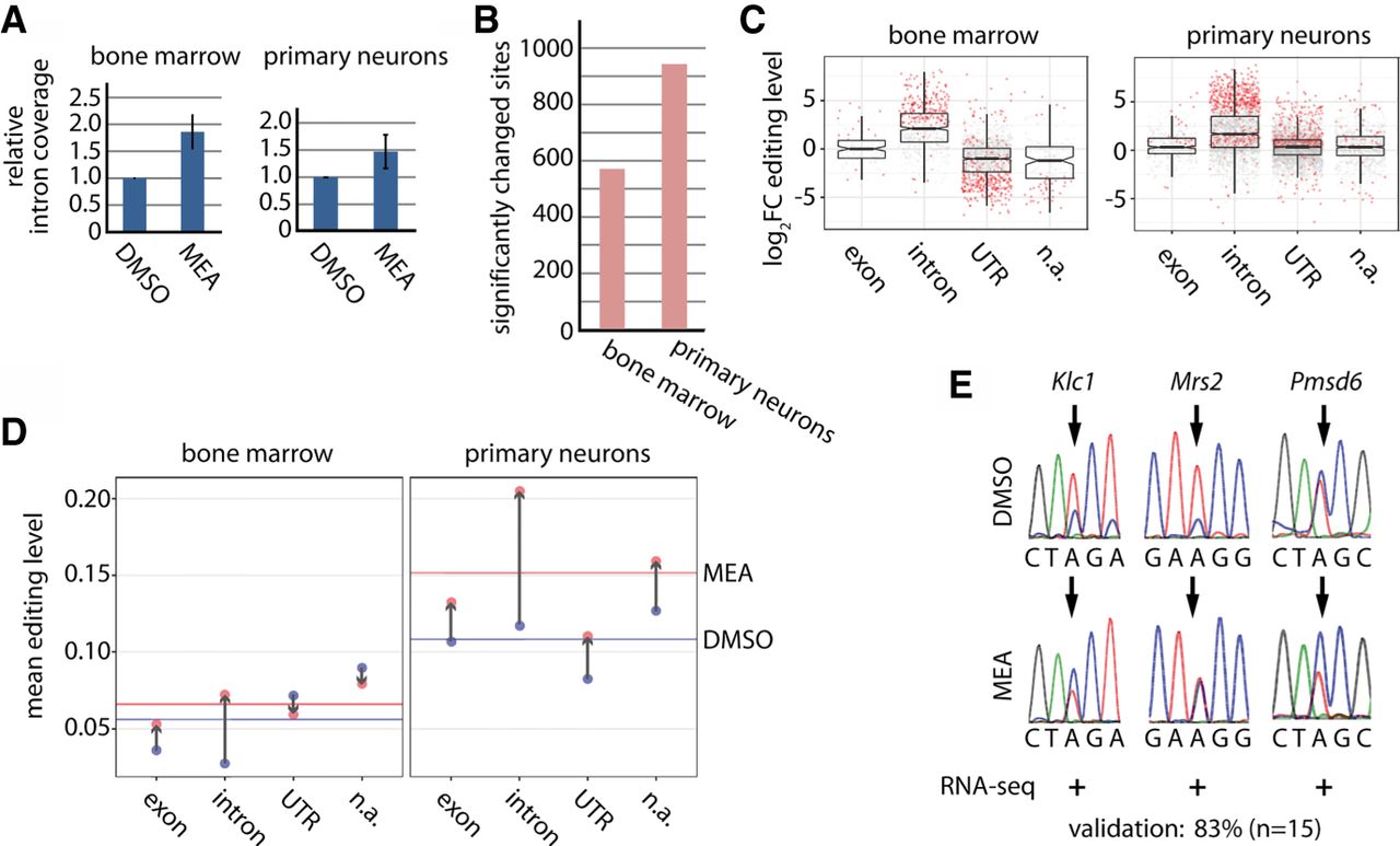 Reduced splicing efficiency globally increases exonic and intronic editing. (A) Either bone marrow cells or primary neurons were treated with the splicing inhibitor meayamcyin (MEA) or vehicle control (DMSO). RNA was isolated after treatment, and poly(A)-selected RNA was subjected to RNA-seq. The relative intronic coverage over editing sites after treatment with MEA is shown. Bone marrow: n = 6, primary neurons: n = 5, error bars = SEM. (B) Bar plot displaying the overall number of significantly changed editing sites for bone marrow and primary neurons. (C) Box plots showing the log2 fold change (log2FC) for editing levels in untreated (DMSO) and treated (MEA) primary cells (bone marrow: left panel, primary neurons: right panel) separated into different genic locations (exonic, intronic, UTR, [n.a.] not annotated, i.e., intergenic). Dots represent single editing sites. Significantly changed sites are highlighted in red (P-value < 0.05). (D) Mean editing levels in bone marrow (left panel) or primary neurons (right panel) for grouped editing sites (intron, exon, UTR, n.a.) under DMSO conditions (blue dots) or meayamycin treatment (red dots). The blue (DMSO) or red (meayamycin) line is drawn at the mean editing level of all sites. Gray arrows indicate the shift in mean editing levels upon meayamycin treatment. (E) Validation of changed editing levels by Sanger sequencing. The editing site is marked by an arrow. The change in editing determined by RNA-seq is given below the chromatograms (+ or − indicates an increase or decrease upon treatment as determined by RNA-seq).