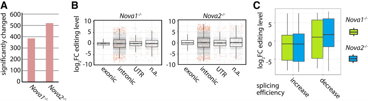 The alternative splicing factors NOVA1 and NOVA2 modulate editing levels. (A) Re-analysis of publicly available RNA-seq data from the cortices of six wild-type and three Nova1−/− and three Nova2−/− mice (Saito et al. 2016). The reads have been mapped to the mouse genome (mm10), and the editing level of known editing sites was determined. The total number of significantly changed editing sites is given (P-value < 0.05). (B) Editing levels in cortices of wild-type and either Nova1−/− (left panel) or Nova2−/− (right panel) knockout mice were determined, and the change in editing levels was plotted. Dots represent single editing sites. Significantly changed sites are highlighted in red (P-value < 0.05). A separate box plot is given for different genic locations (exonic, intronic, UTR, [n.a.] not annotated/intergenic). (C) Box plot showing the log2 fold change of editing levels for editing sites with up-regulated splicing efficiency (increase) or down-regulated splicing efficiency (decrease) for wild-type versus Nova1−/− (green) or wild-type versus Nova2−/− (blue) mice. Splicing efficiency is determined by a decrease (up-regulated splicing efficiency) or increase in intron-specific coverage (down-regulated splicing efficiency) as determined by DEXSeq (P-value < 0.1).
