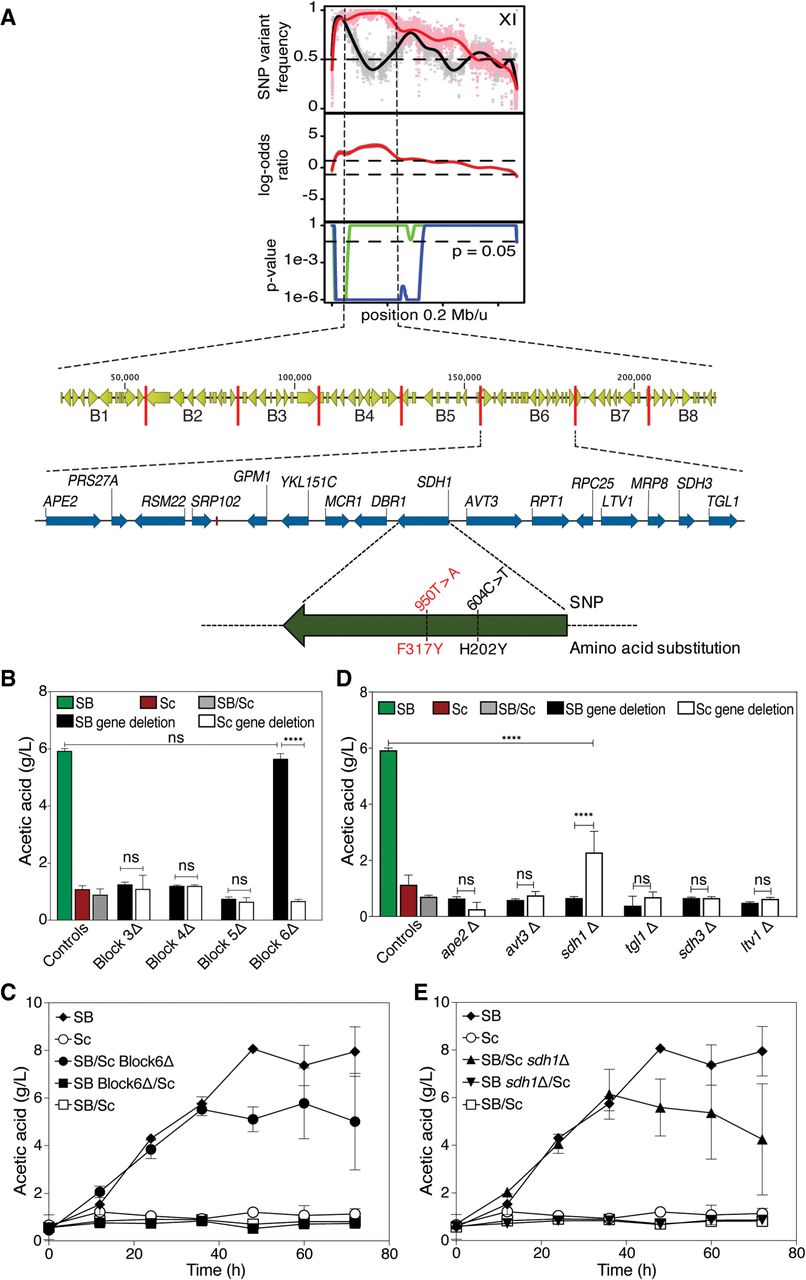 RHA for identification of the causative gene in QTL1. (A) Overview of QTL1 dissection to nucleotide level resolution. Division of QTL1 in eight gene blocks for bRHA and genes present in block 6. Scheme of the SDH1 allele of SBERH6, depicting the two nonsynonymous SNPs in the coding region of SDH1 and their resulting amino acid substitutions in Sdh1. The causative mutation is shown in red. (B) Representative example of bRHA of acetic acid secretion with pairs of SBERH6/S288c (SB/Sc) diploid strains for the blocks 3, 4, 5, and 6 (B3–B6), indicating that block 6 contains one or more causative genes. (C) Acetic acid production as a function of time by the RHA strains with deletion of block 6, SBERH6/S288c B6Δ (•) and SBERH6 B6Δ/S288c (▪) compared to the control strains SB (SBERH6) (♦), Sc (S288c) (○), and SBERH6/S288c (SB/Sc) (□). (D) RHA with the individual genes present in block 6, identifying SDH1 as causative gene. (E) Acetic acid production as a function of time by the RHA strains for the SDH1 gene, SB/Sc sdh1Δ (SBERH6/S288c sdh1Δ) (▴) and SB sdh1Δ/Sc (SBERH6 sdh1Δ/S288c) (▾), compared to the control strains Sb (SBERH6) (♦), Sc (S288c) (○), and SBERH6/ S288c (□). Results are the means of three biological replicates for each time-point. Error bars show standard deviation at each time-point. Data were analyzed by two-way ANOVA (Tukey's multiple comparisons test). Significant differences in acetic acid accumulation between strains are indicated with asterisks, (****) P < 0.0001, (ns) nonsignificant.