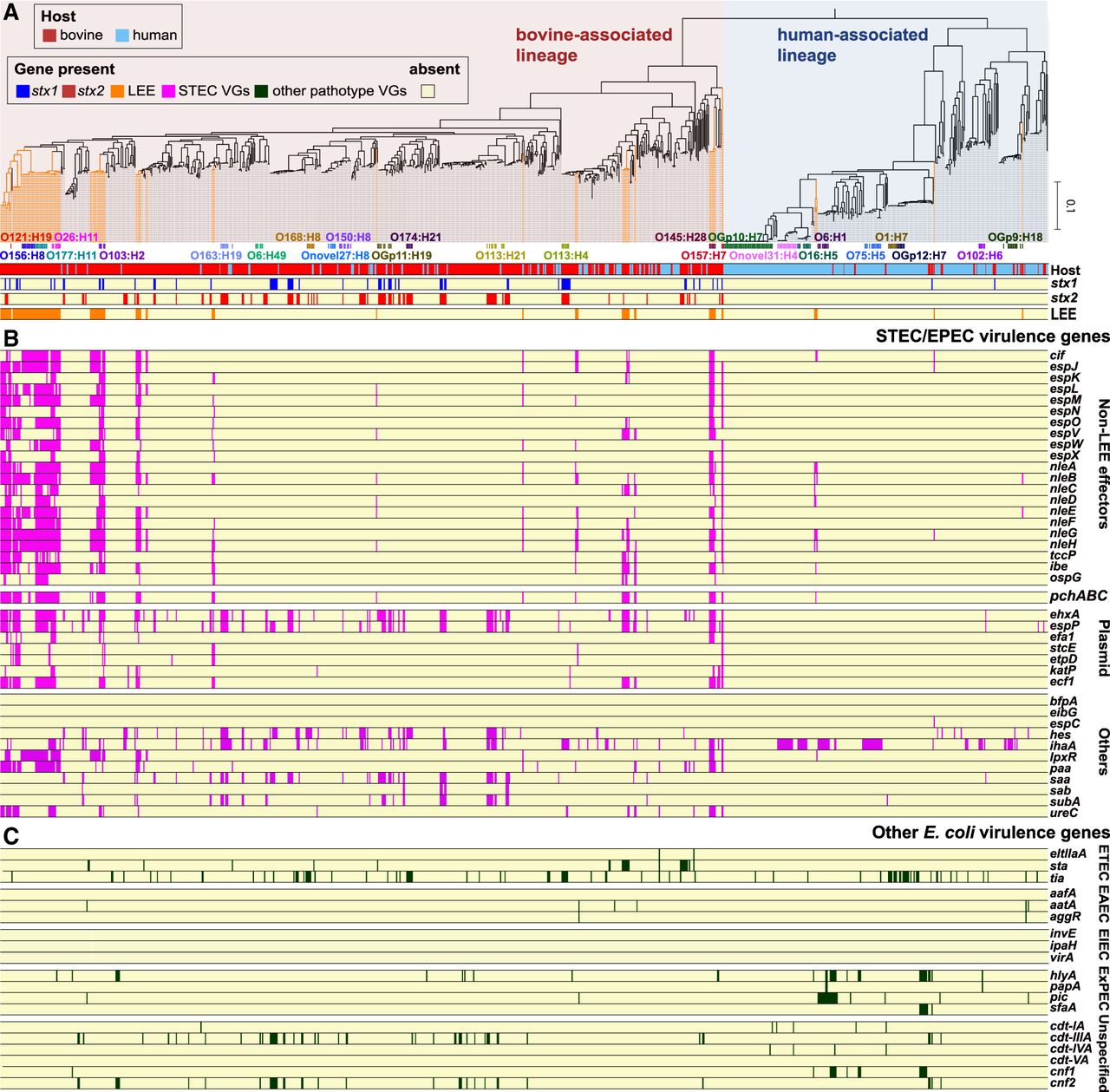 Distribution of virulence genes among 937 bovine and human commensal E. coli strains. (A) The ML tree based on 262,788 SNP sites on 1958 core genes. The tree was rooted by cryptic Escherichia clade I strain TW15838. LEE-positive lineages/strains are highlighted by orange lines. Frequently observed serotypes (more than four strains) and major STEC serotypes are indicated. The presence of stx1, stx2, and LEE in each strain is shown. The presence of other STEC/EPEC virulence genes (B) and virulence genes associated with other E. coli pathotypes (C) is shown, respectively. For the functions and nucleotide sequences of each gene analyzed, see Supplemental Table S7.