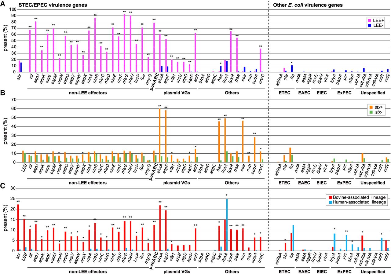 Conservation of STEC/EPEC-related and other E. coli virulence genes in bovine and human commensal isolates. Conservation of the virulence genes of STEC/EPEC and those of other E. coli pathotypes in LEE-positive (n = 104) and LEE-negative (n = 833) strains (A), in stx-positive (n = 146) and stx-negative (n = 791) strains (B), and in the bovine-associated (n = 647) and human-associated (n = 290) lineages (C) are summarized. Statistical analyses were performed using the two-sided Fisher's exact test. Asterisks indicate that the differences were significant after the Bonferroni correction for multiple comparisons: (*) P < 0.05; (**) P < 1 × 10−6.