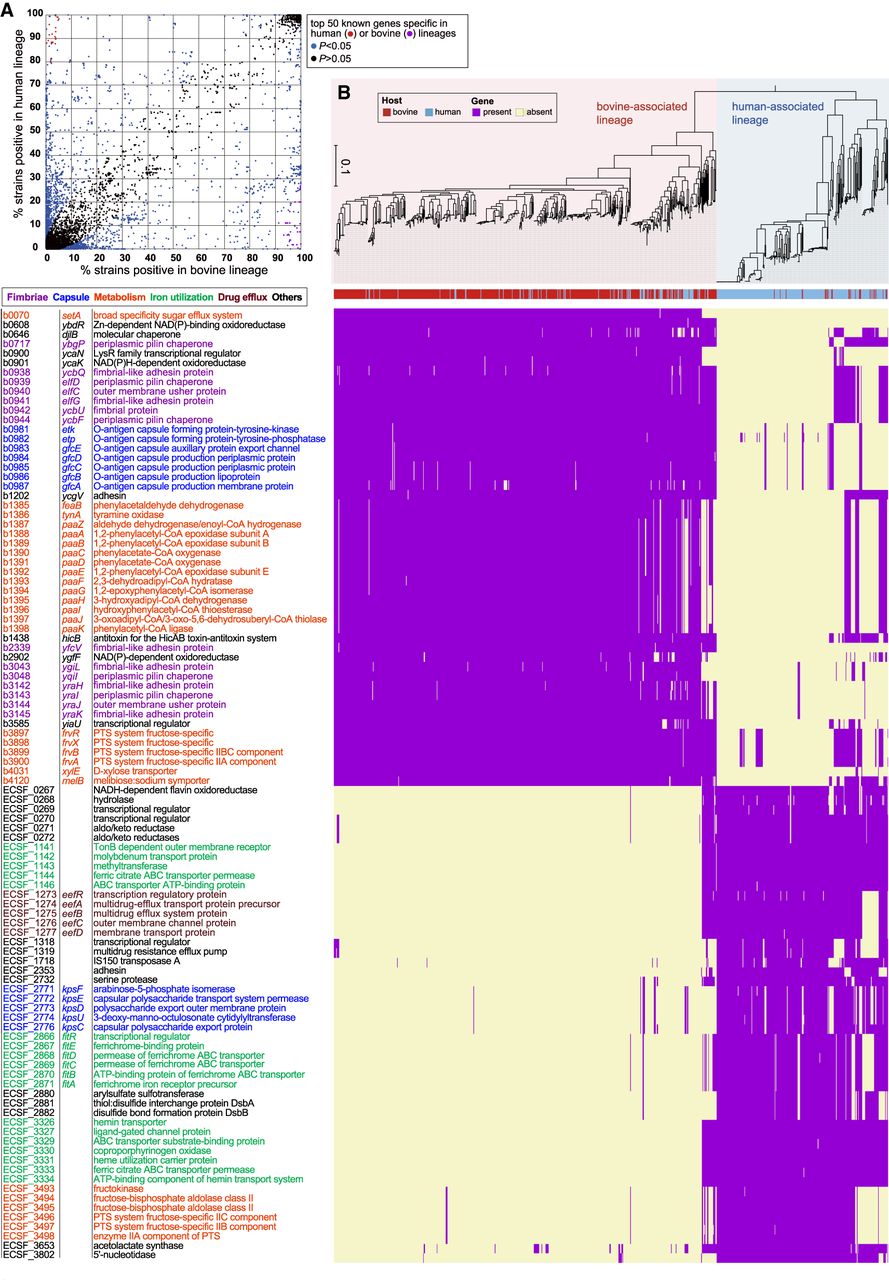 Bovine- or human-associated lineage-specific gene. (A) A scattered plot of gene conservation in the bovine- and human-associated lineages. Genes that were significantly (positively or negatively) associated with the bovine-associated lineage (Bonferroni P < 0.05) are indicated by blue dots. Among the positively associated (bovine-associated lineage-specific) and negatively associated (human-associated lineage-specific) genes, the top 50 genes with known or predictable functions (Bonferroni P < 1 × 10−135 and P < 1 × 10−141, respectively) are indicated in each group by purple and red dots, respectively. (B) Distribution of the bovine- or human-associated lineage-specific genes in the core gene–based ML tree (the same tree shown in Fig. 2). Presence and absence of each gene are indicated by purple and beige, respectively.