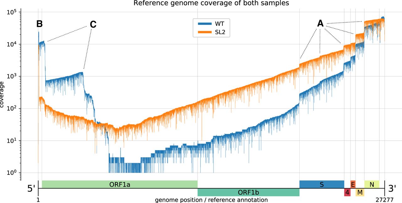Reference genome coverage of the HCoV-229E WT sample (blue) and the SL2 sample (orange) based on alignments with minimap2. There is an inverse correlation between sg RNA abundance and length. (A) Notable vertical “steps” in the coverage correspond to borders expected for the canonical sg RNAs (see Fig. 1). (B) The presence of the leader sequence (∼65 nt) in canonical sg RNAs gives rise to the sharp coverage peak at the 5′-end. (C) We also observed unexpected “steps,” especially in the WT sample (blue). We hypothesize that the sequences correspond to DI-RNA molecules that may arise by recombination at TRS-like sequence motifs as well as other sites displaying sequence similarities that are sufficient to support illegitimate recombination events (see Fig. 3). We attribute the difference in the observed (noncanonical) recombination sites between the two samples to biological factors that we either did not control for or do not know (see also legend to Fig. 3).