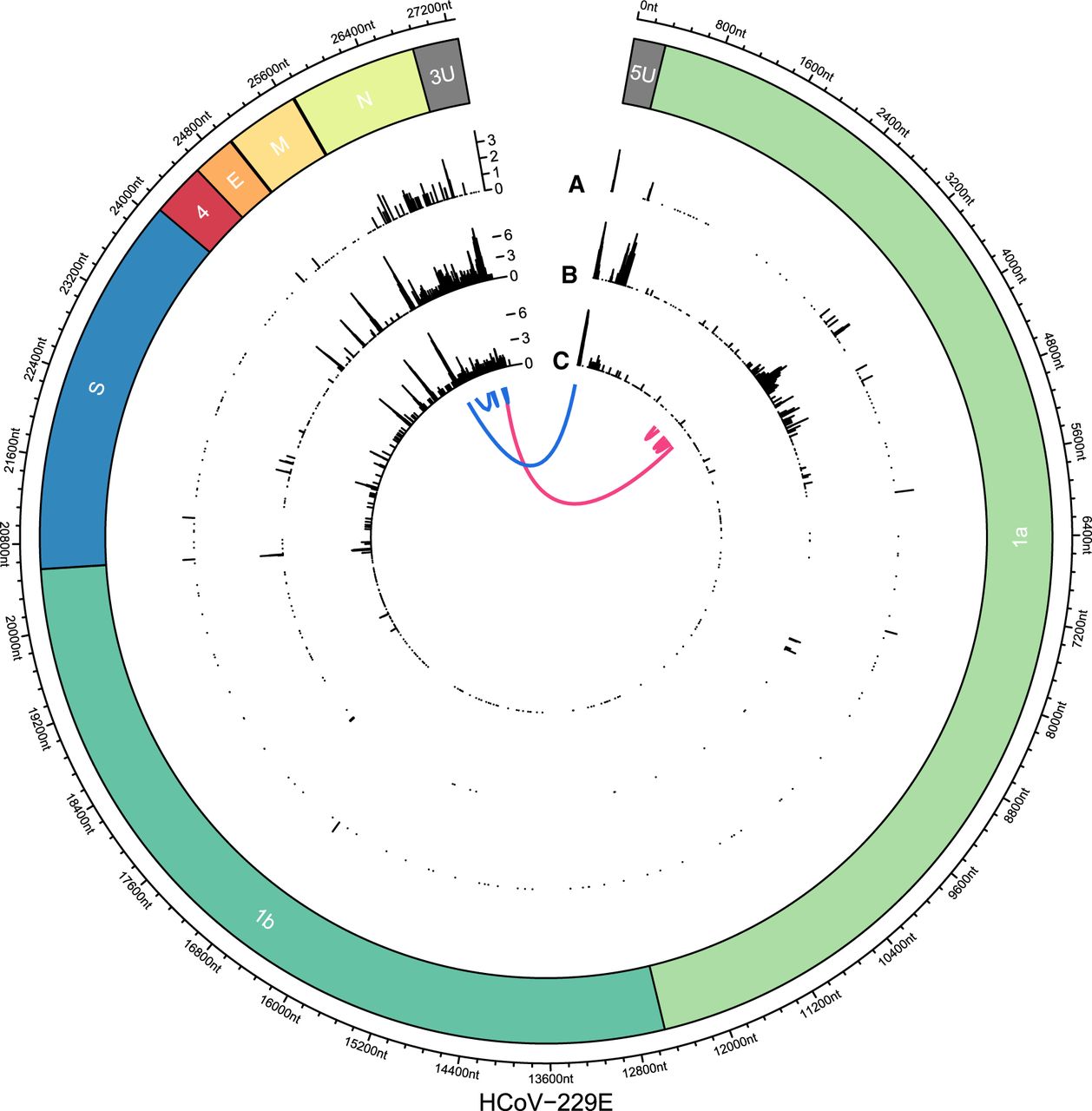 Joining of noncontiguous genome sequences in sg RNAs identified in HCoV-229E–infected cells. On the circular axis, the annotations of the reference genome (including 5′ UTR [5U] and 3′ UTR [3U]) are shown. Genomic positions of “discontinuous sites” identified in Illumina reads (A; outer track), nanopore reads of sample HCoV-229E WT (B; middle track), and nanopore reads of SL2 sample (C; inner track) reveal multiple recombination sites across the whole genome. An aggregation of recombination sites can be observed in the region that encodes the viral N protein. Furthermore, clear recombination sites can be seen at intergenic boundaries and at the 5′ and 3′ UTRs, with the former corresponding to the boundary between the leader sequence and the rest of the genome. Another prominent cluster can be observed in ORF1a in the WT nanopore sample but not in SL2. This cluster is supported by the WT Illumina data, excluding sequencing bias as a potential source of error. We hypothesize that because samples WT and SL2 were obtained from nonplaque-purified serially passaged virus populations derived from in vitro transcribed genome RNAs transfected into Huh7 cells, differences in the proportion of full-length transcripts versus abortive transcripts could translate into different patterns of recombination. Generally, nanopore-based sequencing allows more detailed analysis of recombination events owing to the long read length. Even complex isoforms such as two exemplary reads, each with four discontinuous segments, can be observed (blue and pink).